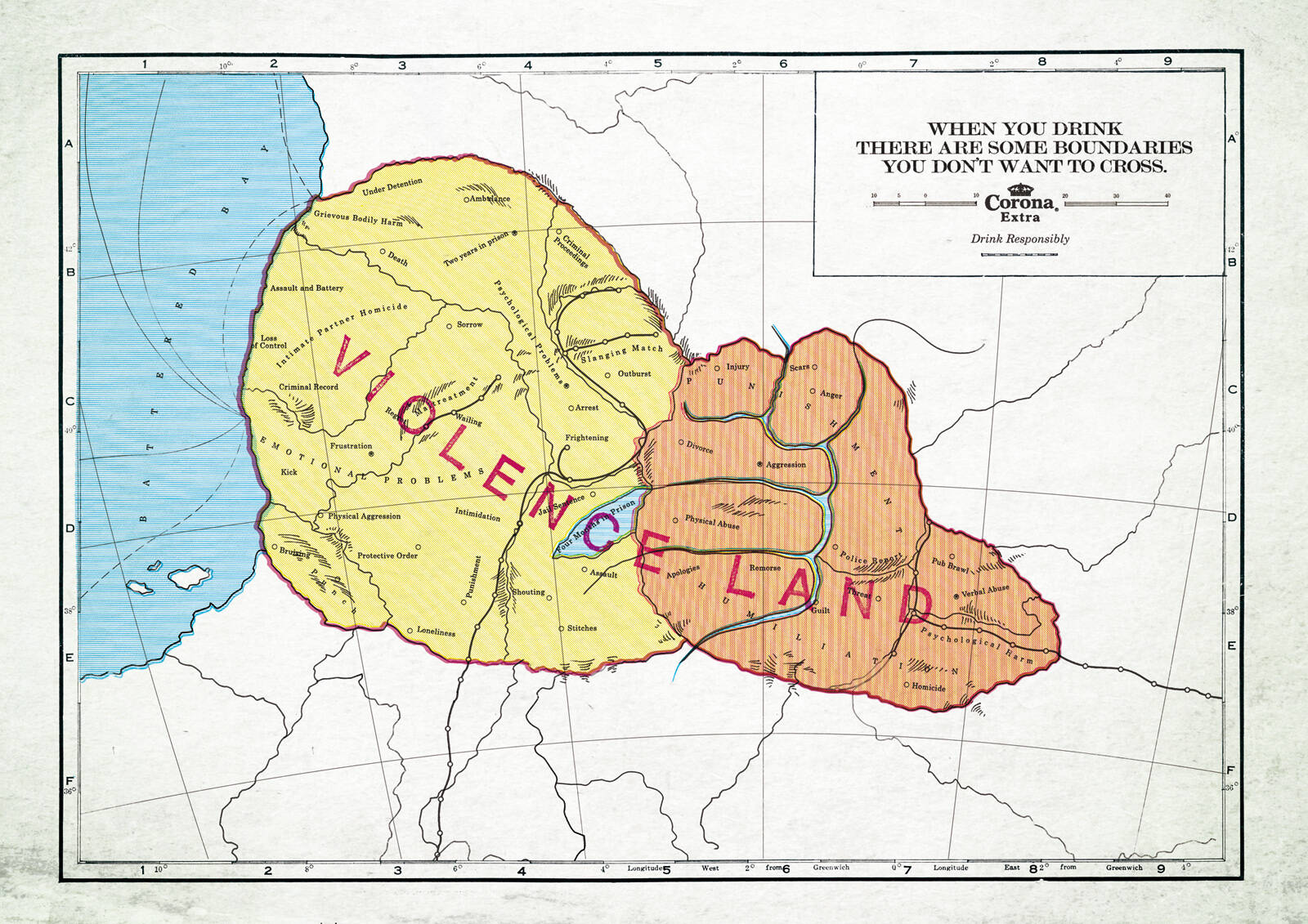 This professional campaign titled 'Depression state, Crash county, Violence land' was published in Spain in April, 2012. It was created for the brand: Corona Beer, by ad agency: JWT. This Print medium campaign is related to the Alcoholic Drinks industry and contains 3 media assets. It was submitted over 13 years ago.