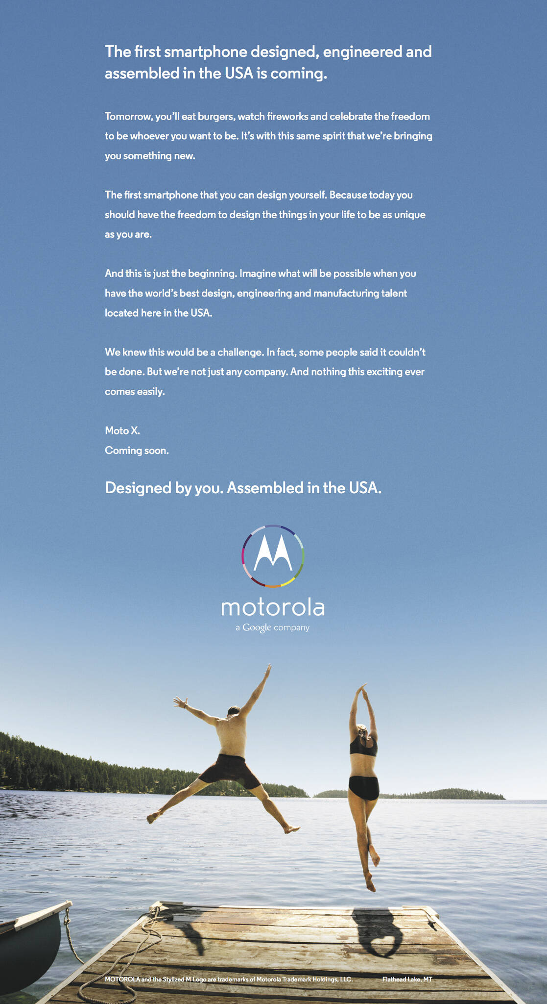 This professional campaign titled 'Designed by you. Assembled in the USA.' was published in United States in July, 2013. It was created for the brands: Google and Motorola, by ad agency: Droga5. This Print medium campaign is related to the Electronics, Technology industry and contains 1 media asset. It was submitted over 12 years ago.