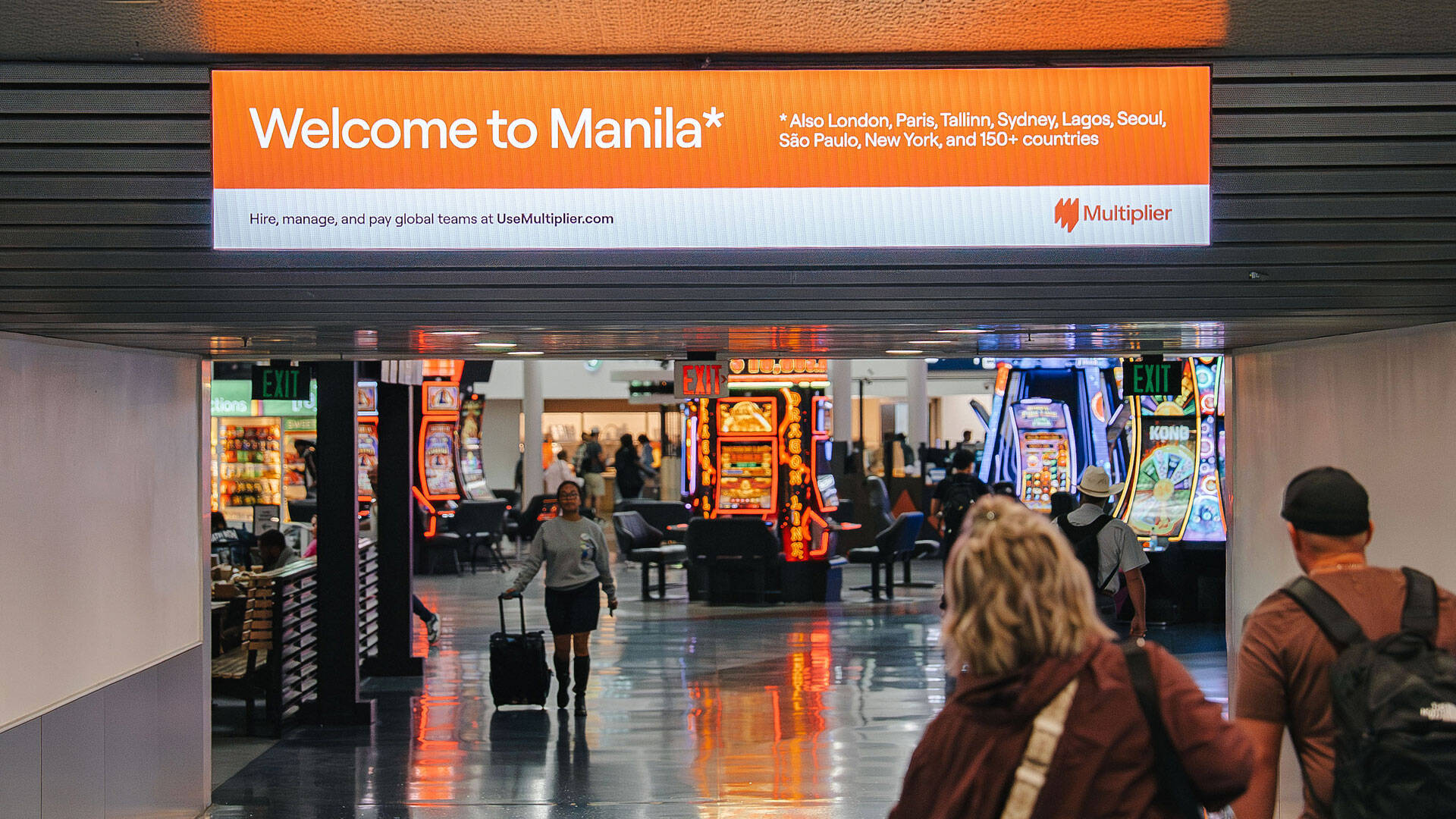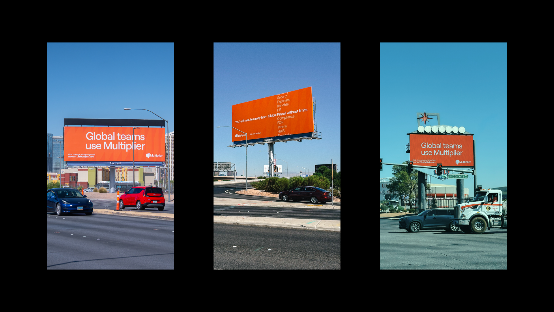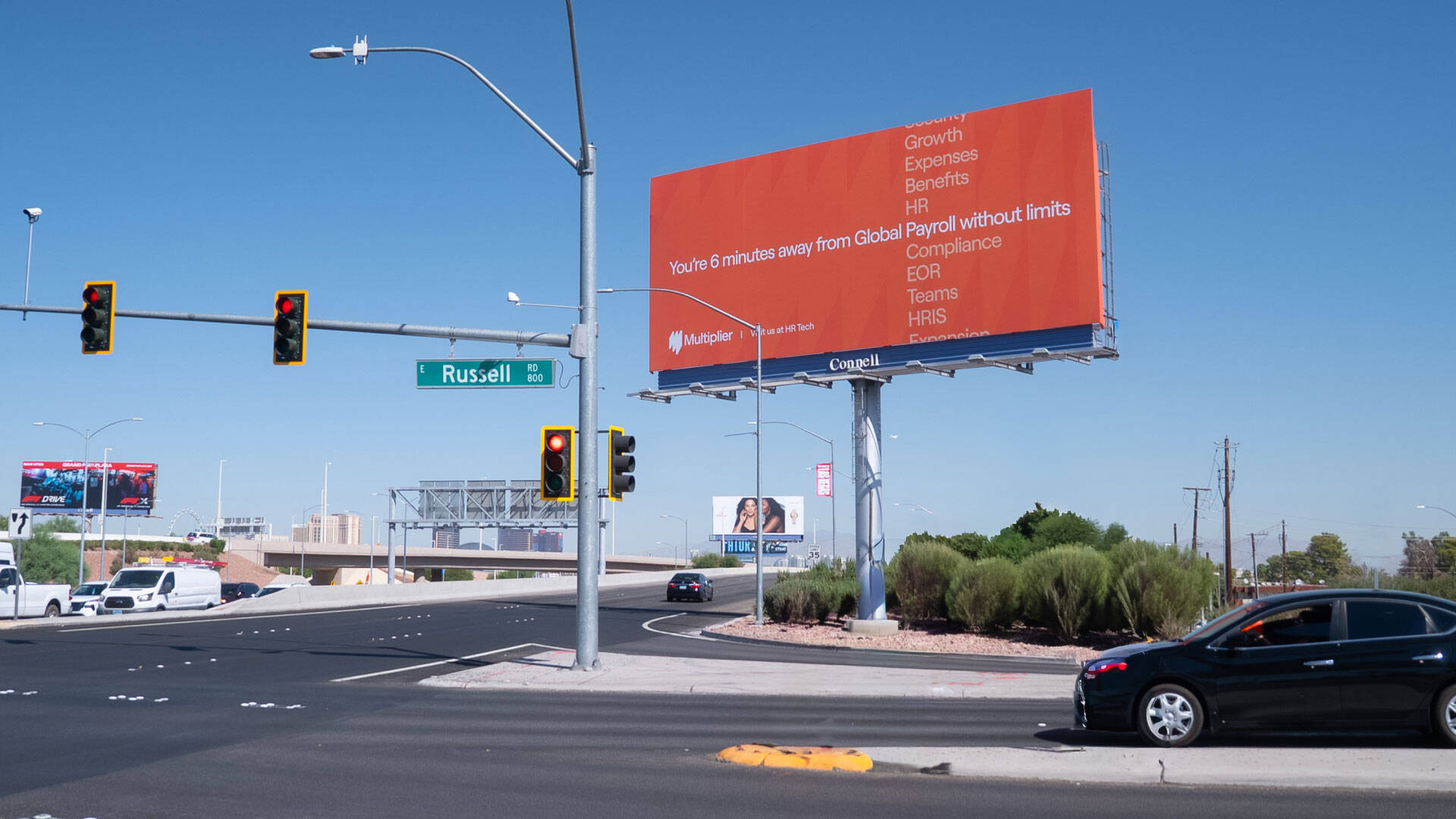 The borderless journey (OOH billboards): Messaging continued along the route to the event center, reminding attendees they could land in Vegas and hire in 150+ countries" making the world feel instantly accessible. This reinforced Multiplier's Key Verbal, "Beyond borders," while positioning our platform as the catalyst for immediate global expansion. Ultra-concise copy like 'Global teams use Multiplier' cemented our claim as the category leader.