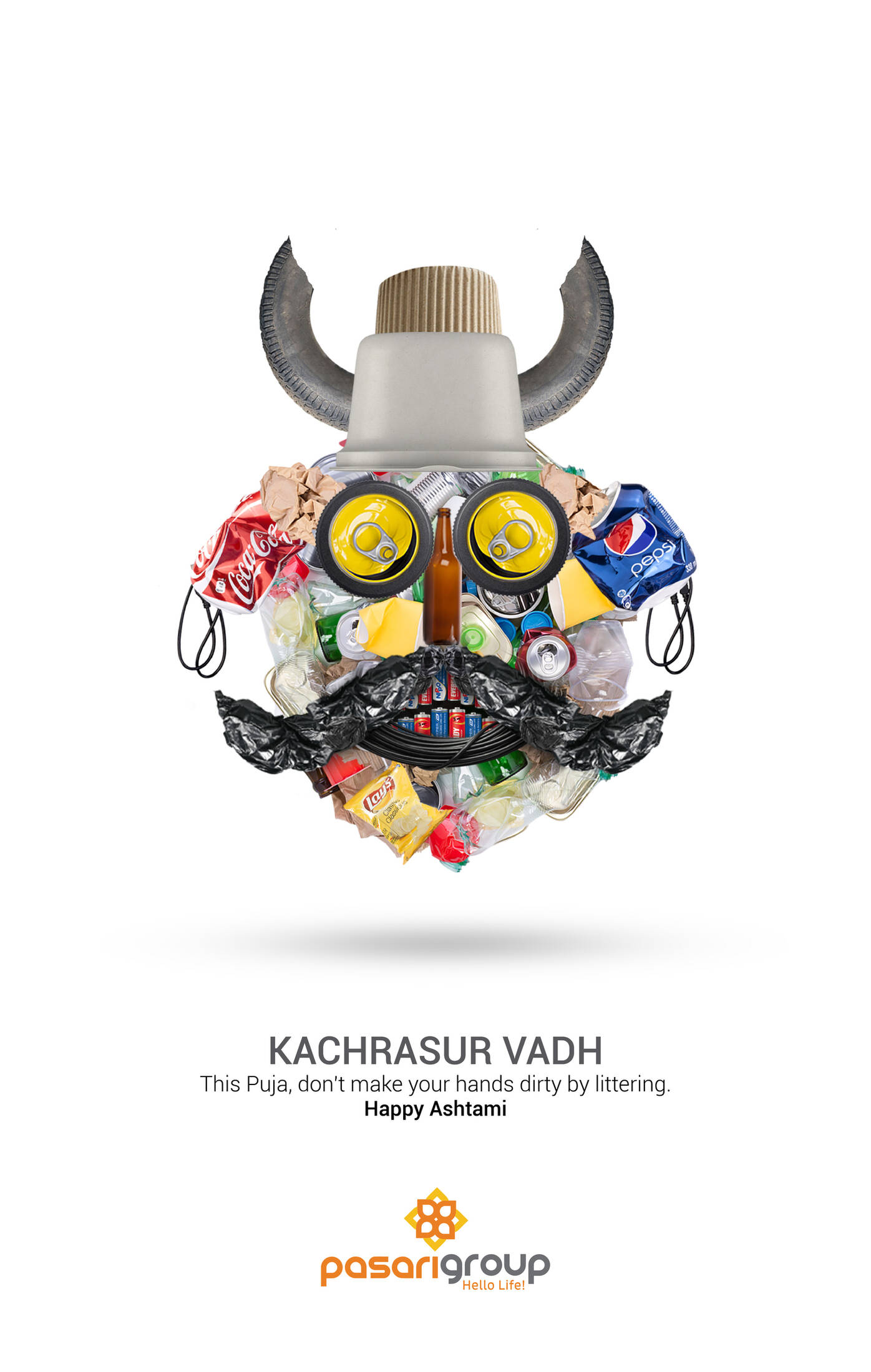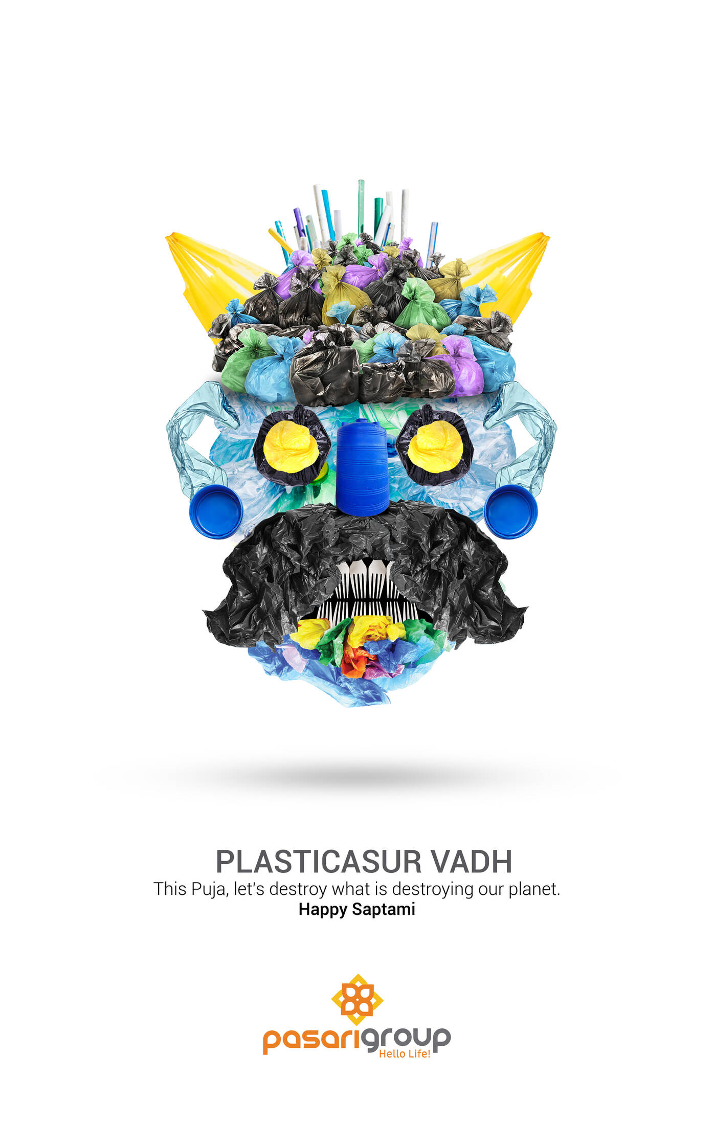 Presenting the Durga Puja social media campaign for the real estate brand Pasari Group. Durga Puja is a ten day annual Hindu festival that reveres and pays homage to Goddess Durga. The festival marks the victory of Goddess Durga against the shape-shifting demon 'Mahisasur'. It epitomises the victory of good over evil. The deadliest demon humanity faces today is undoubtedly 'Pollution'. Hence, various types of pollution are personified and given a demon-like face. The only way to get rid of these is to 'Asur (Demon) Vadh (Destruction)' which means 'Destruction of the Demon'. The most harmful types of pollution has been highlighted in the campaign so that most people can relate and work towards a pollution-free environment. These types we have highlighted are 'Dhuasur Vadh' (Destruction of Air Pollution), 'Kachrasur Vadh' (Destruction of Littering), 'Plasticasur Vadh' (Destruction of Plastic Pollution' and 'Awazasur Vadh' (Destruction of Sound Pollution).