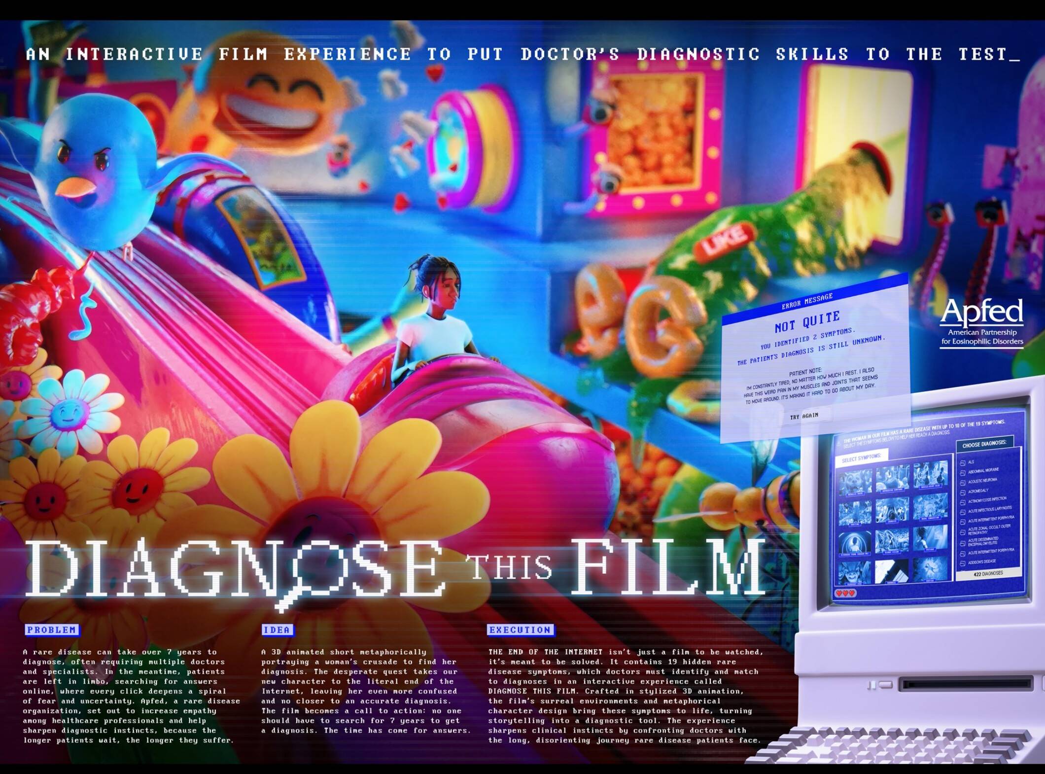 The solution reimagines medical education as an interactive challenge. Hosted on a retro-style website, Diagnose This Film pairs an animated short with a diagnostic simulation that asks healthcare professionals to identify 19 hidden symptoms and arrive at the correct diagnosis, restarting if they make a single error. This structure mirrors the frustration patients experience and turns passive viewing into an immersive, emotional learning experience. Since launch, the project drove 3,000 doctor visits in one month, a five-minute average time on site, a 43 percent increase in intent to screen for rare diseases, and positioned Apfed as a leader in behavior-changing clinical education.