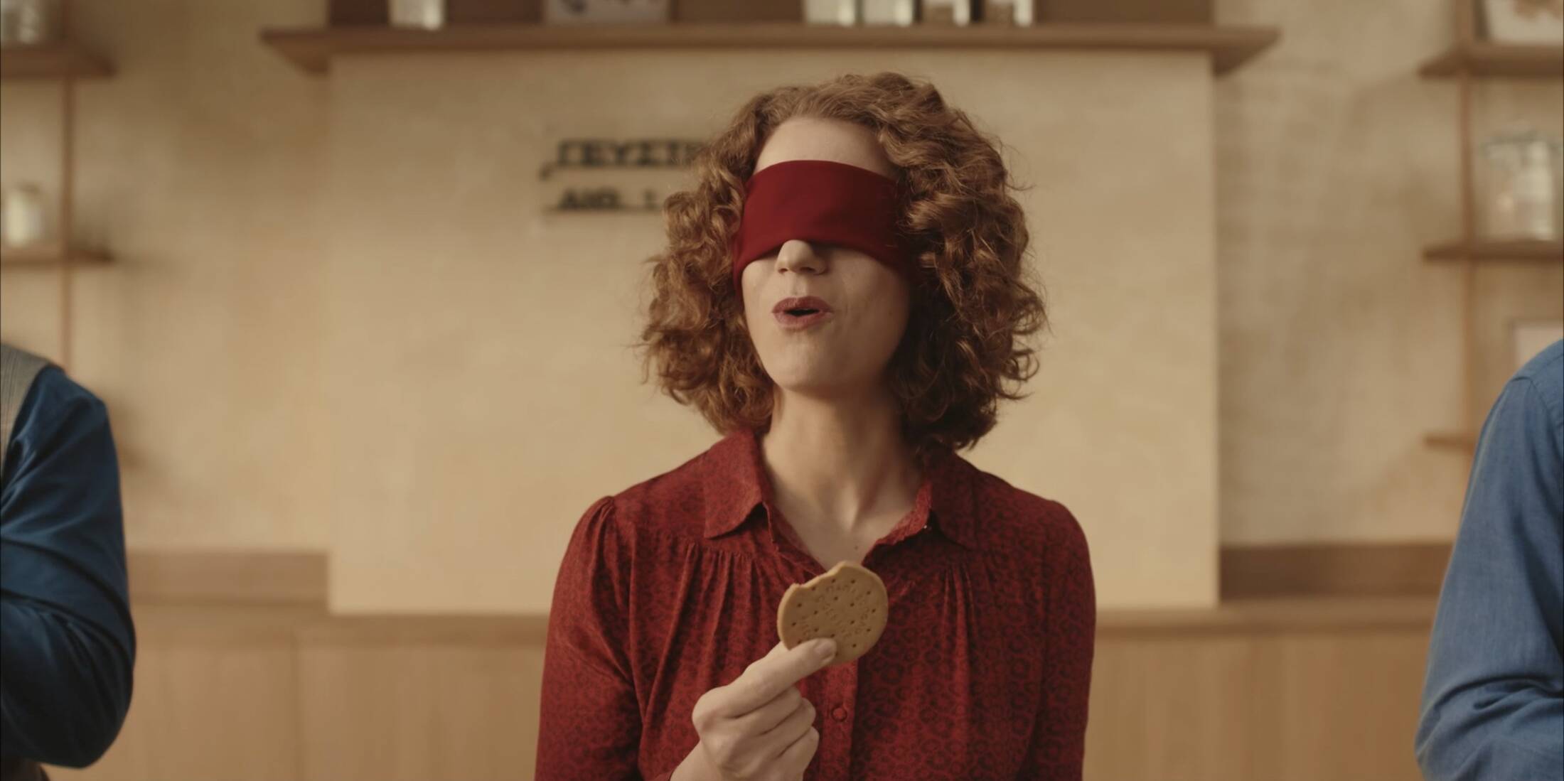 Within this unique setting, characters engage in sharp, snappy dialogue as they casually taste biscuits, treating the experience with understated seriousness and simplicity. The tone is clean, witty, and confident, allowing the product to remain the hero.