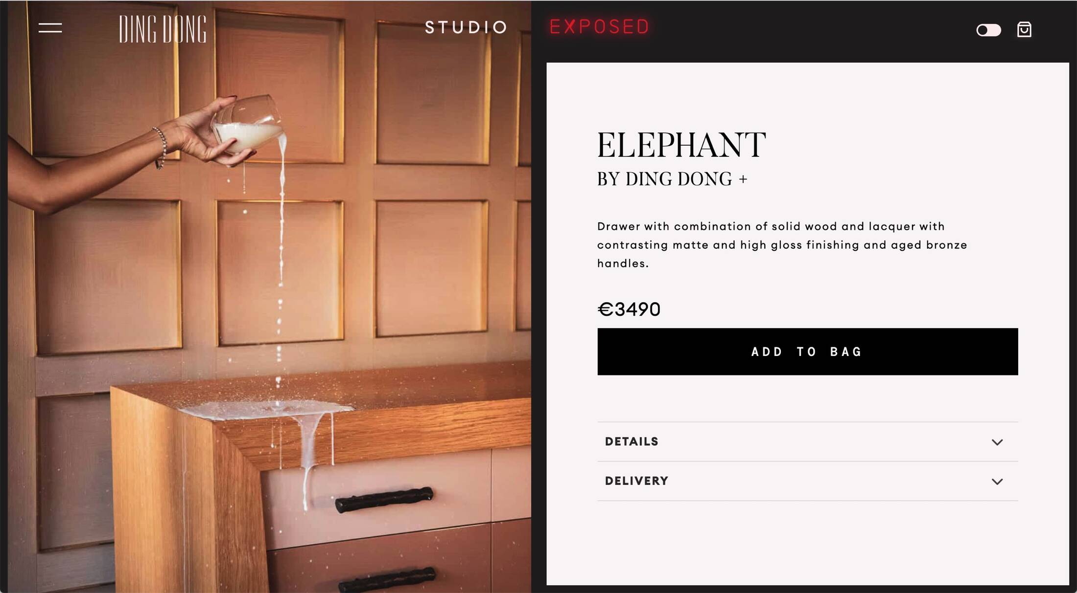 Ding Dong is a bold interior design studio and store. They wanted their new online store to showcase their love of objects and to be as unconventional as they are. So https://dingdong.exposed was born. An interior design online store for you, an adult website for those who literally love objects. Objectophiles or objectum sexuals are people who find real connections with objects, something Ding Dong can very well understand. So, instead of just your typical white background pictures of the objects for sale, dingdong.exposed embraces the adult website concept by featuring pictures of people interacting with the objects in intimate settings, highlighting the objects materials and how they must feel to the touch. The website also features a dark mode for an even more intimate setting. The website is divided into 6 object categories: Fetish, featuring objects made of leather or just more unconventional in their shapes; Hairy, featuring tapestry and other objects; Heavy, featuring all the biggest objects like drawers, sideboards, etc…; Legs, featuring tables, chairs and any object with, well, legs; Turned On, featuring lamps; Voyeur, featuring objects with mirrors and glass. For your viewing pleasure, besides the pictures, you can also watch live cam show perfomances of some of the objects. All the objects featured at dingdong are for sale, taking buying the object of your desire to a whole new level.