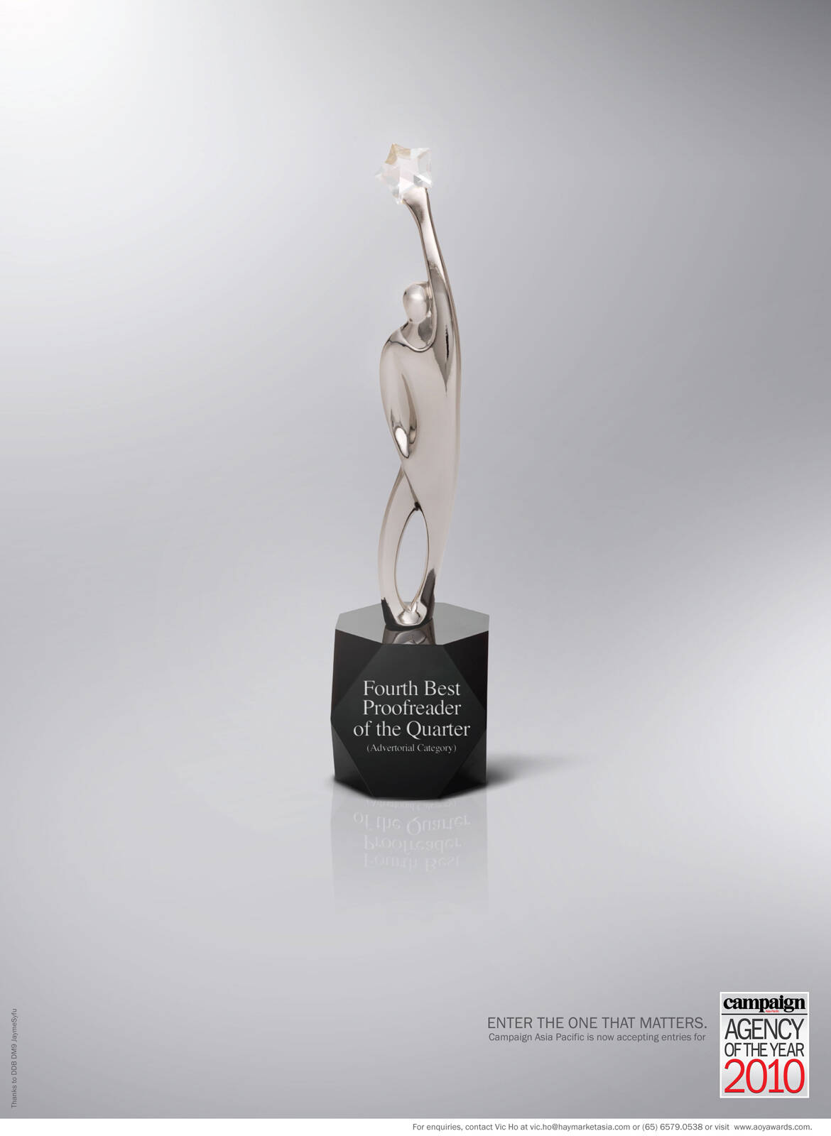 This professional campaign titled 'Direct, Mid-Sized, Proofreader' was published in Philippines in October, 2010. It was created for the brand: Campaign Asia-Pacific, by ad agency: DM9 JaymeSyfu. This Print medium campaign is related to the Professional Services industry and contains 3 media assets. It was submitted about 15 years ago.
