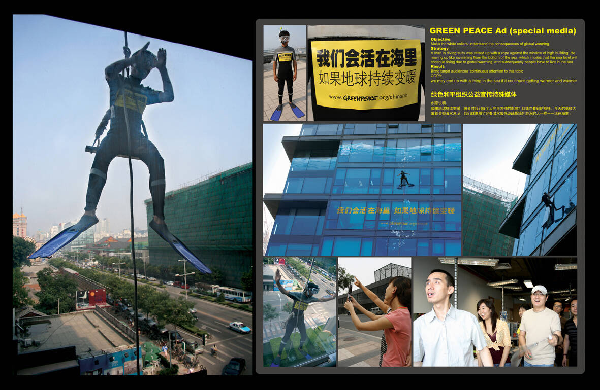 This professional campaign titled 'Diver' was published in China in May, 2007. It was created for the brand: Greenpeace, by ad agency: JWT. This Ambient medium campaign is related to the Public Interest industry and contains 1 media asset. It was submitted over 17 years ago.