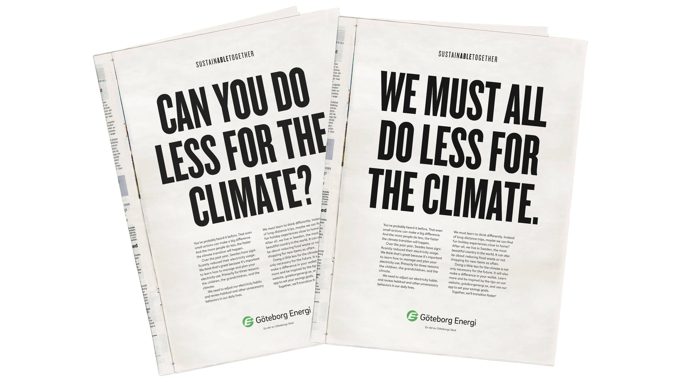 This professional campaign titled 'Do Less for the Climate!' was published in Sweden in October, 2023. It was created for the brand: Göteborg Energi, by ad agency: Welcom. This Integrated, OOH Outdoor, and Print media campaign is related to the Other and Public Utility industries and contains 3 media assets. It was submitted about 2 years ago by Strategic Copywriter: Niclas Hallgren of Welcom.