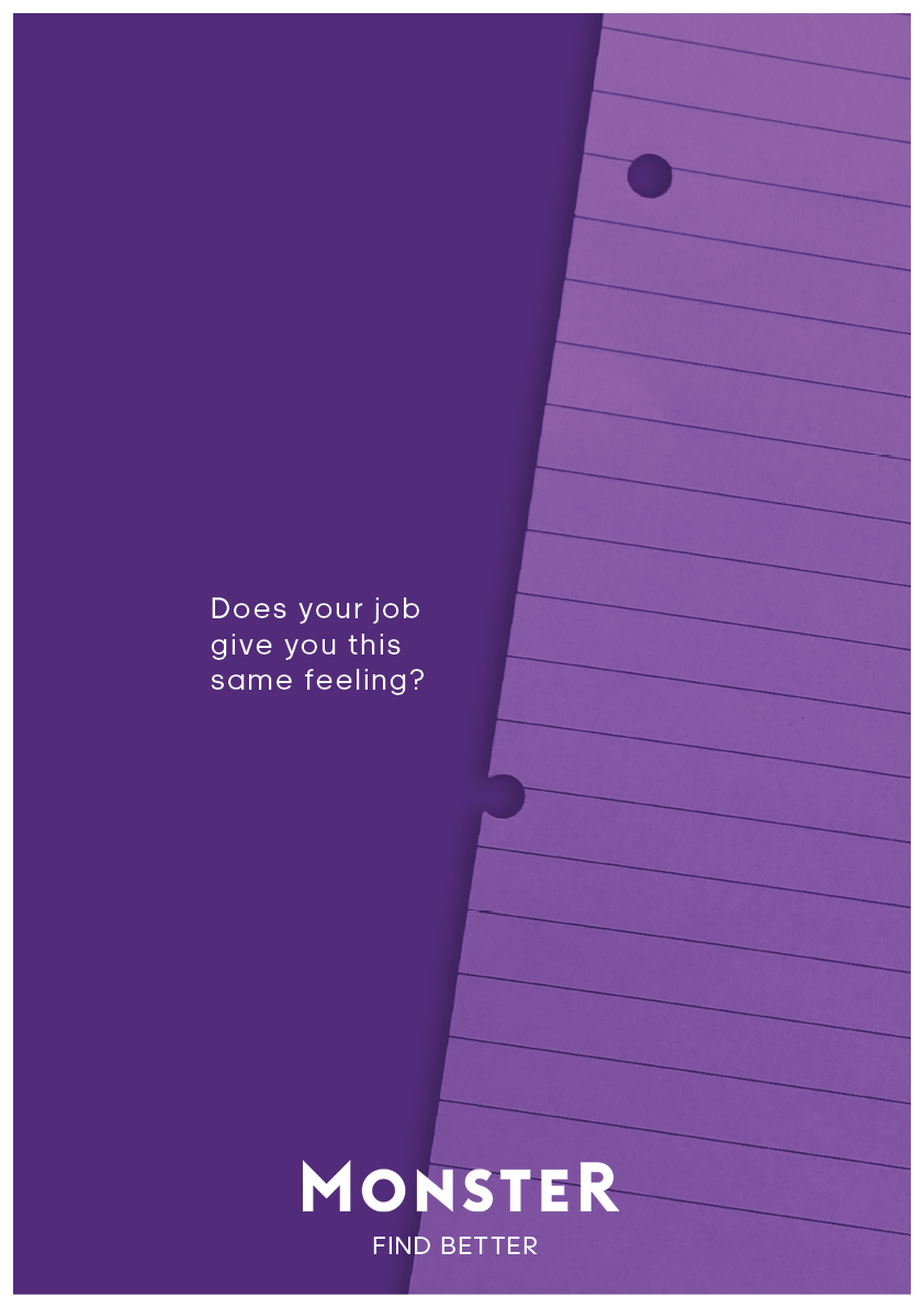 This student campaign titled 'Does Your Job Give You This Same Feeling' was published in Germany in January, 2019. It was created for the brand: Monster, by ad school: Miami Ad School. This Print medium campaign is related to the Professional Services industry and contains 3 media assets. It was submitted almost 7 years ago.
