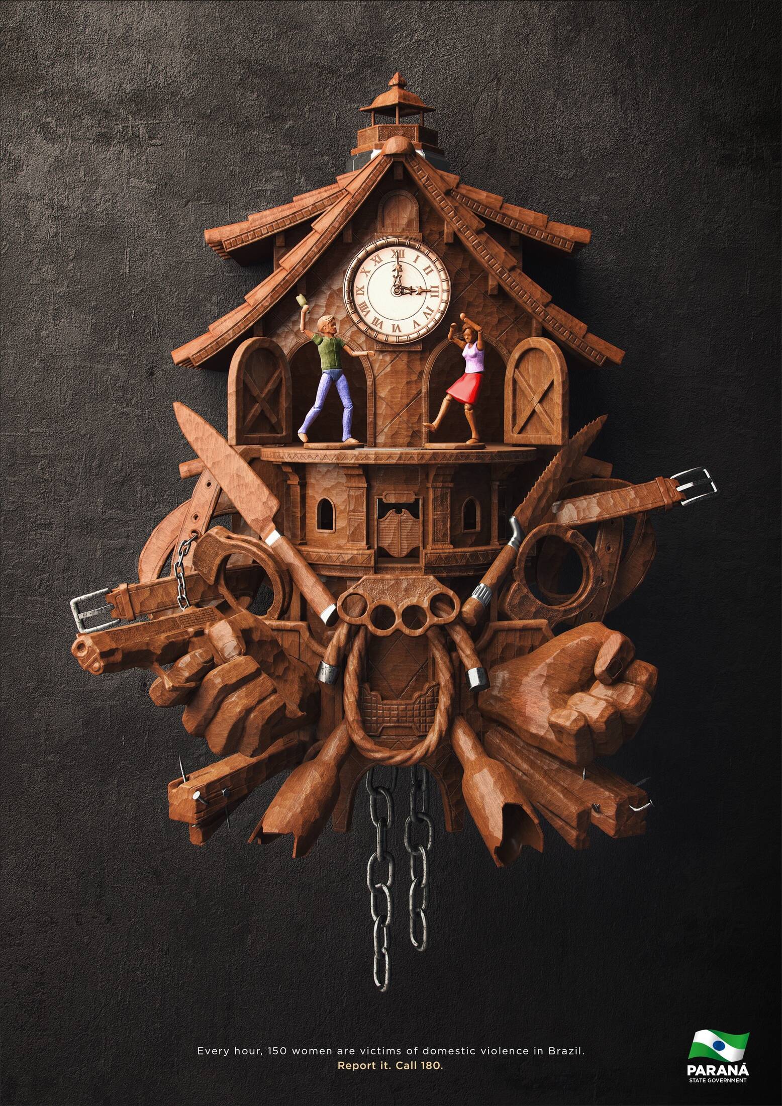 This professional campaign titled 'Domestic violence cuckoo clock' was published in Brazil in March, 2016. It was created for the brand: Government of Paraná State, by ad agency: Master. This Print medium campaign is related to the Public Interest industry and contains 1 media asset. It was submitted over 9 years ago.