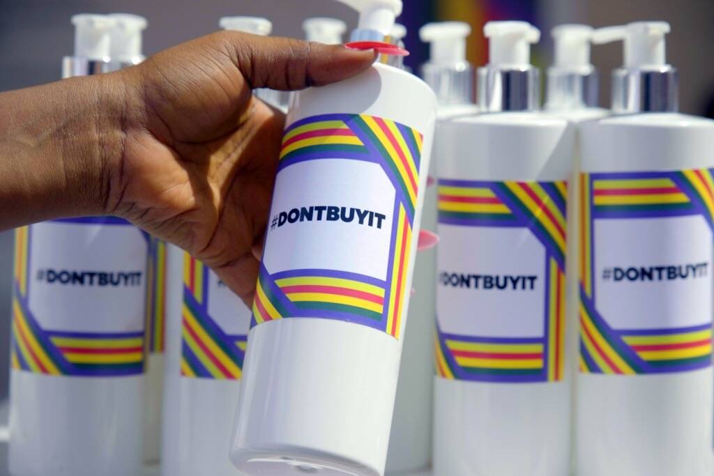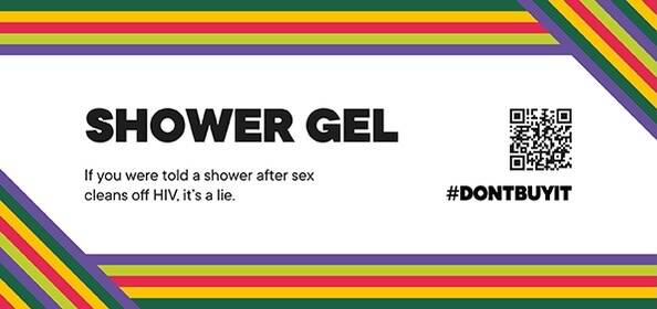 The stall displays a range of #DontBuyIt branded products carrying myth-busting messages: #DontBuyIt shower gel, for example, bears the message: “If you were told a quick shower cleans off any HIV, it’s a myth. Don’t buy it!” #DontBuyIt branded drinking glasses say: “Drinking ice cold water after sex can’t stop you getting pregnant. Don’t buy it”.