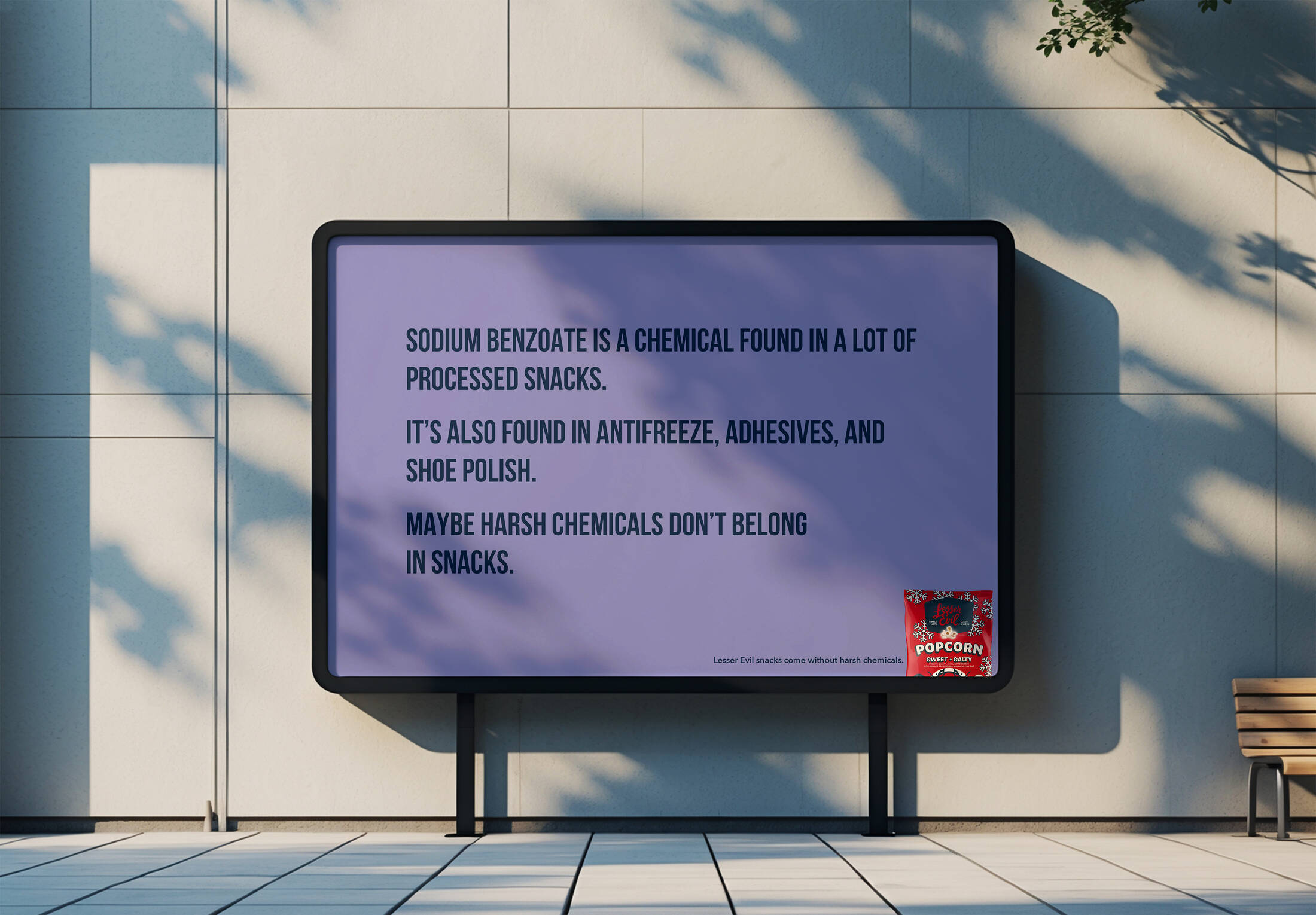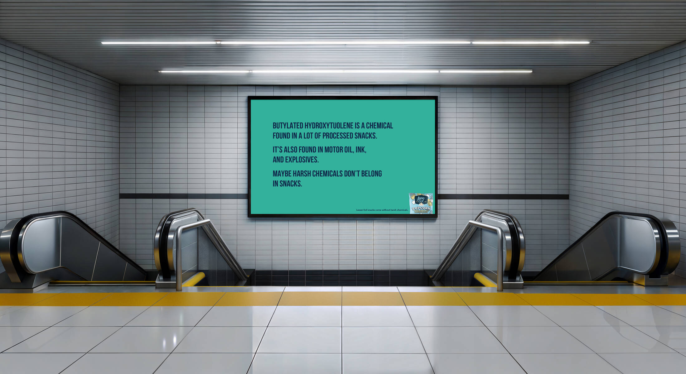 This student campaign titled 'Don't eat chemicals ' was published in United States in December, 2025. It was created for the brand: LesserEvil, by ad school: S.I. Newhouse School of Public Communications. This OOH Outdoor medium campaign is related to the Confectionery, Snacks and Food industries and contains 3 media assets. It was submitted about 15 hours ago.