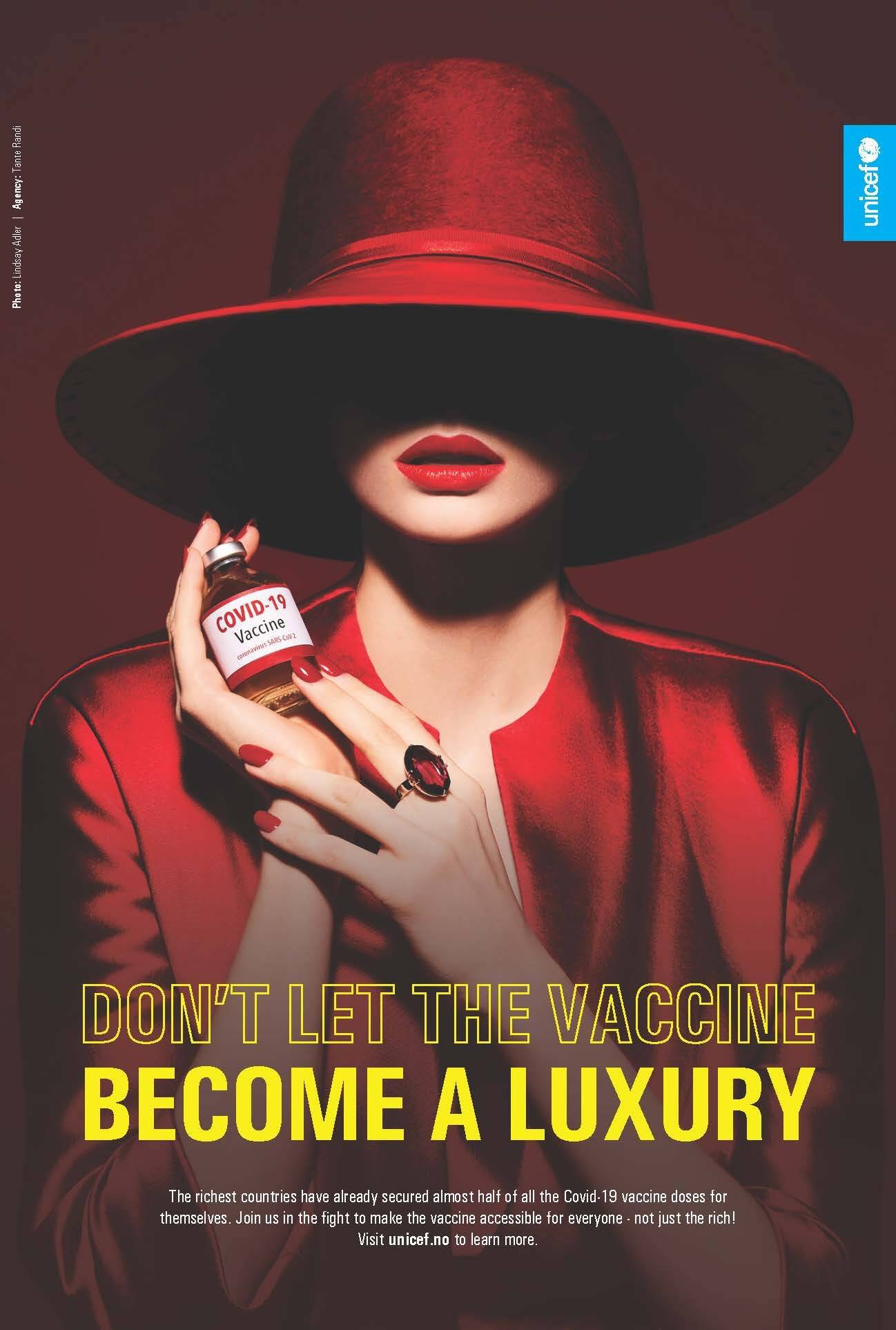 This professional campaign titled 'Don't let the vaccine become a luxury' was published in Norway in December, 2020. It was created for the brand: Unicef, by ad agency: Tante Randi. This Integrated medium campaign is related to the Public Interest industry and contains 6 media assets. It was submitted almost 5 years ago by Copywriter: Glenn Haugen of Tante Randi.