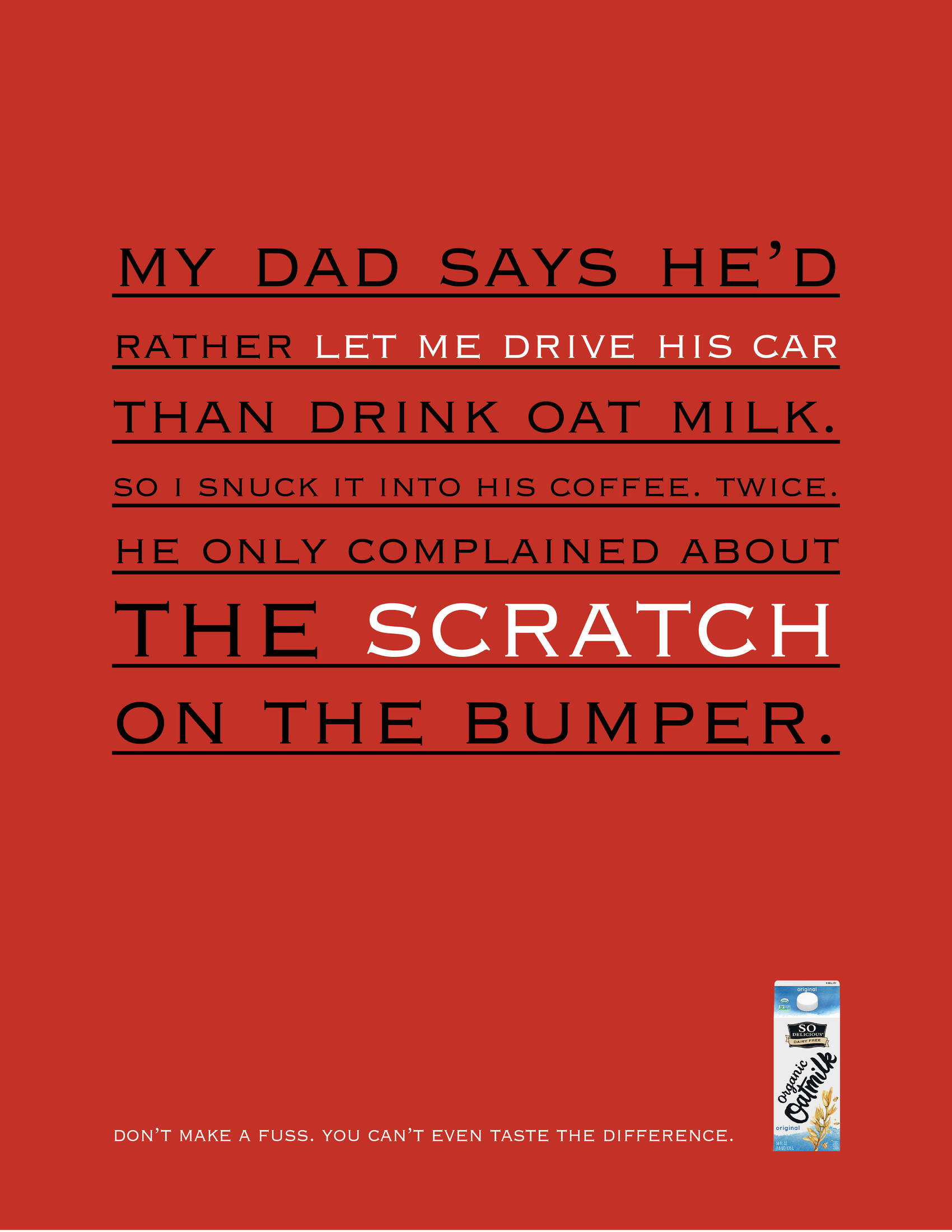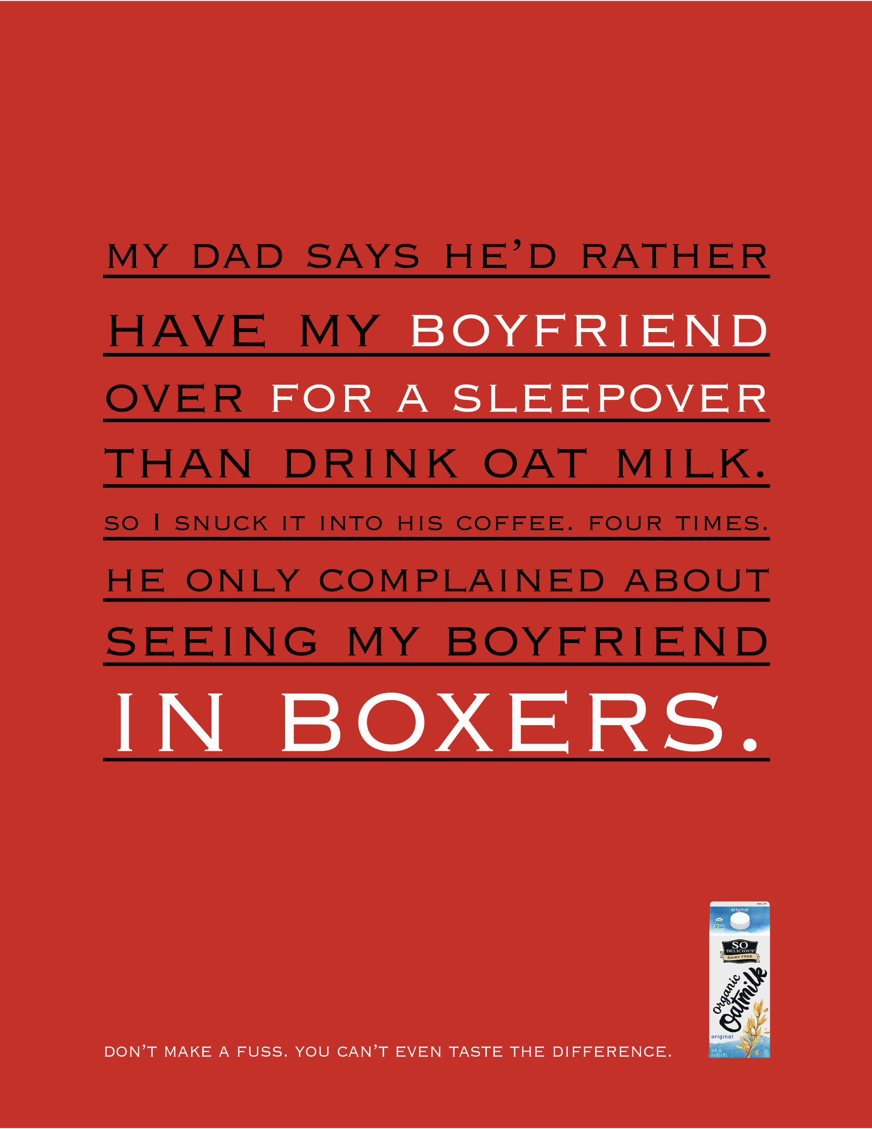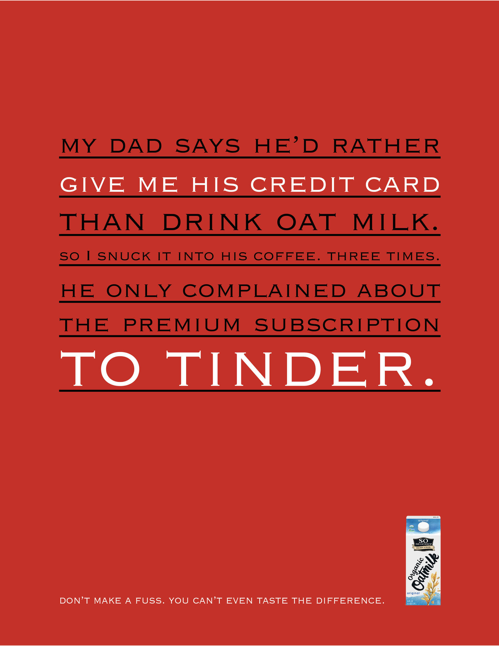 This student campaign titled 'Don’t make a fuss. ' was published in United States in April, 2024. It was created for the brand: So Delicious Dairy Free Wondermilk, by ad school: S.I. Newhouse School of Public Communications. This OOH Outdoor and Print media campaign is related to the Food industry and contains 3 media assets. It was submitted over 1 year ago.