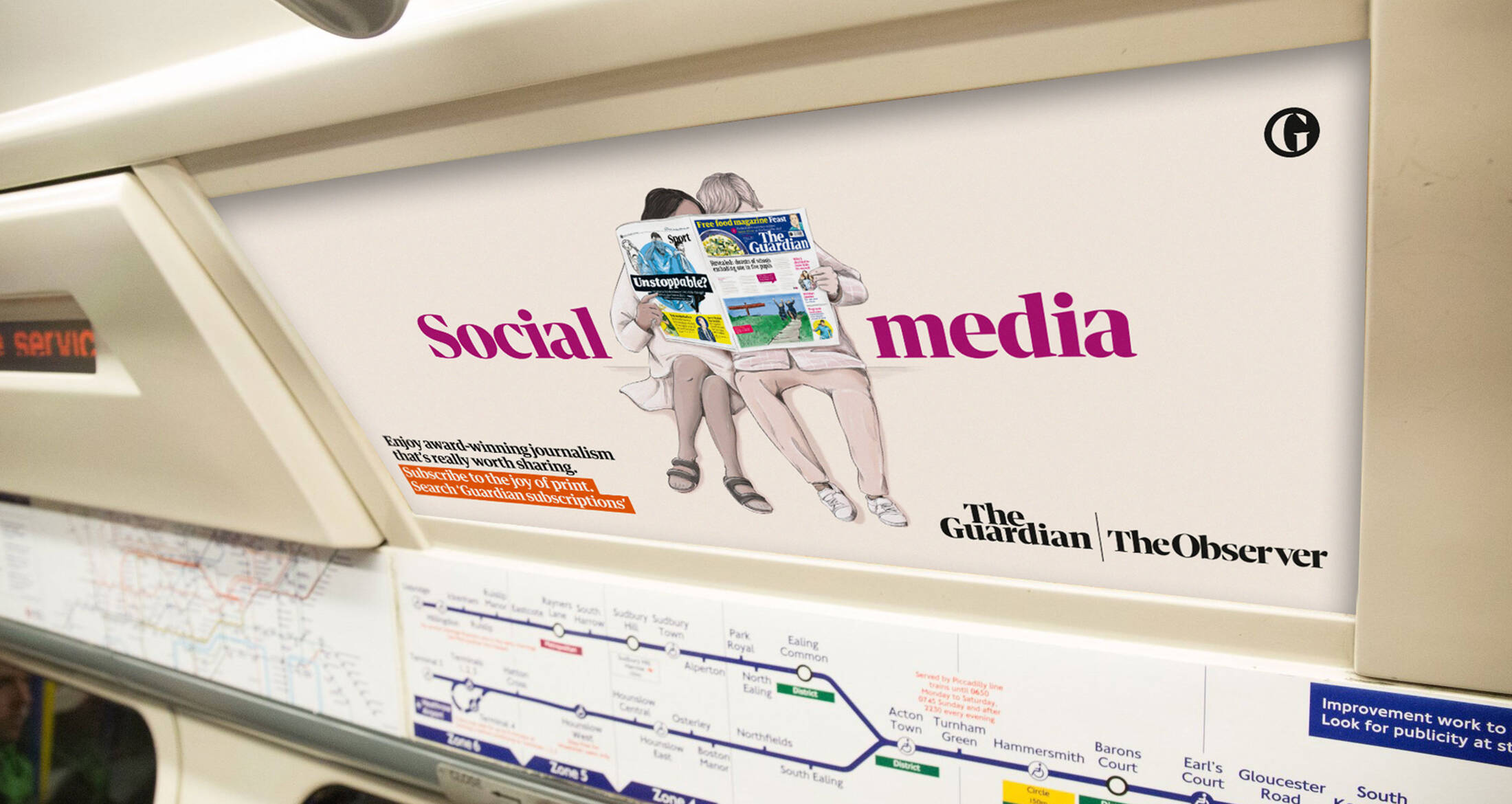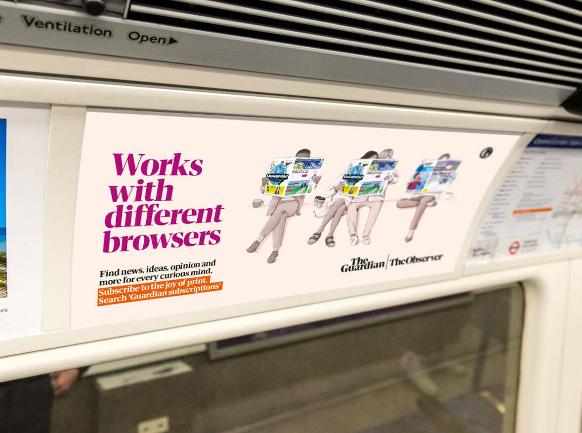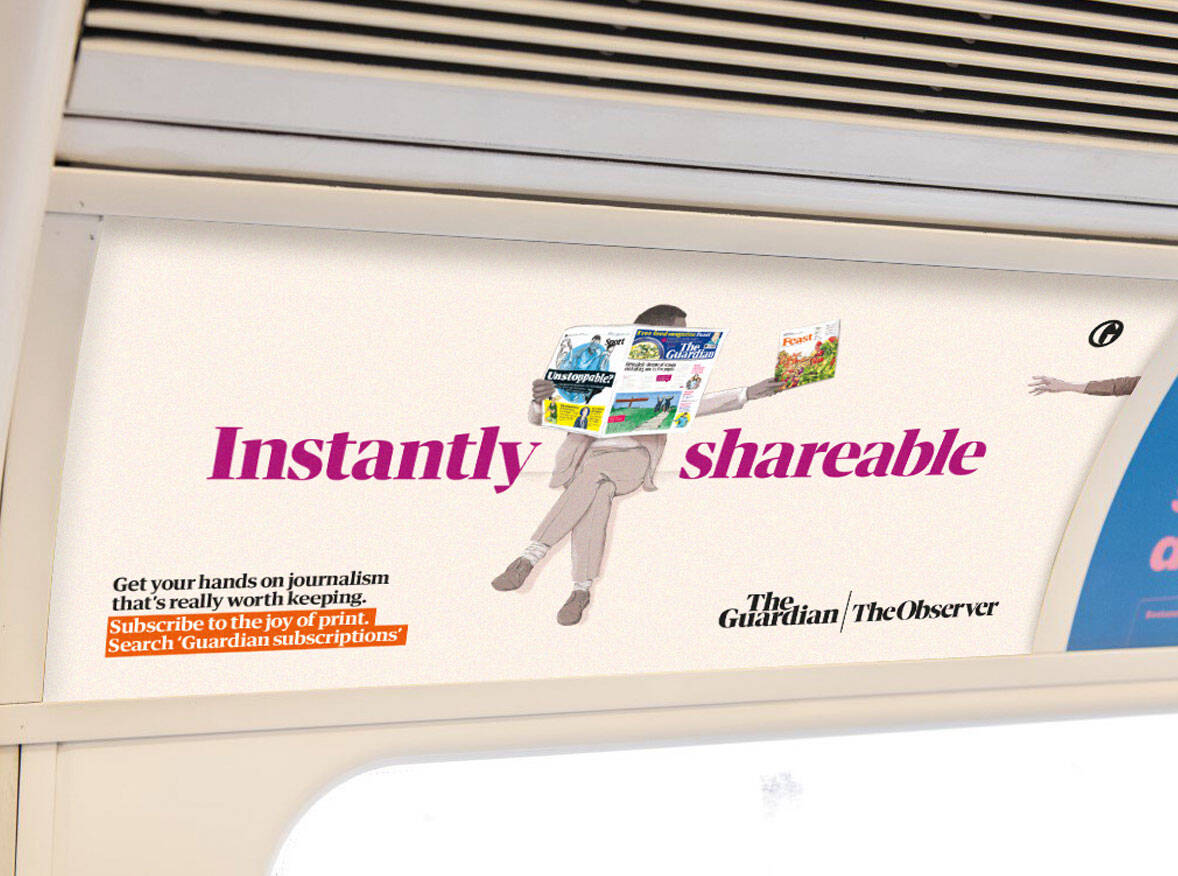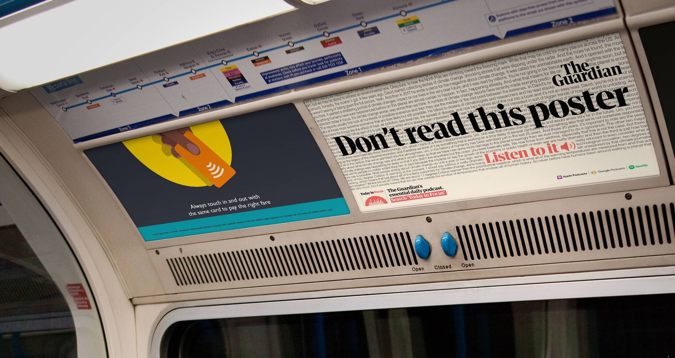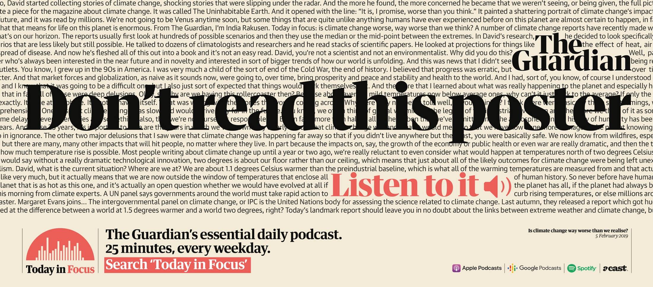 The ads, which are running on the London Underground network as well as print and social media, promote The Guardian’s daily news podcast Today in Focus. They feature audio transcripts from two recent podcast episodes on climate change and Brexit, with large font overlapping the text to direct attention to a call to action: "Don’t read this poster. Listen to it". The design plays on the setting of a Tube carriage and the benefits of listening on the move.