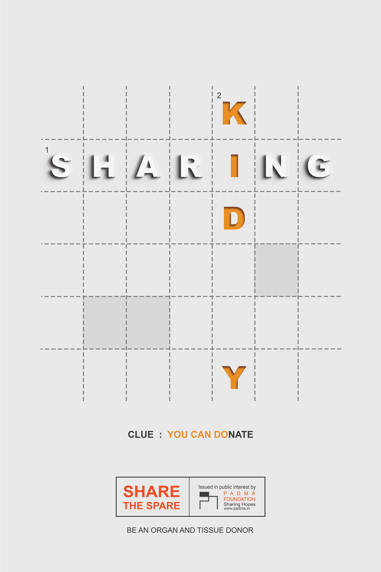 "SHARE THE SPARE"- Organ donation is where we need to realize the importance of sharing in mankind. The feeling of missing that a patient has for an organ can be fulfilled by our decision of becoming an organ donor. The message has been conveyed through a simple idea of crossword puzzle where the word "Sharing" itself has been shared with another word. Print advertisement created by College of Art, India for Padma Foundation, within the category : Public Interest, NGO.