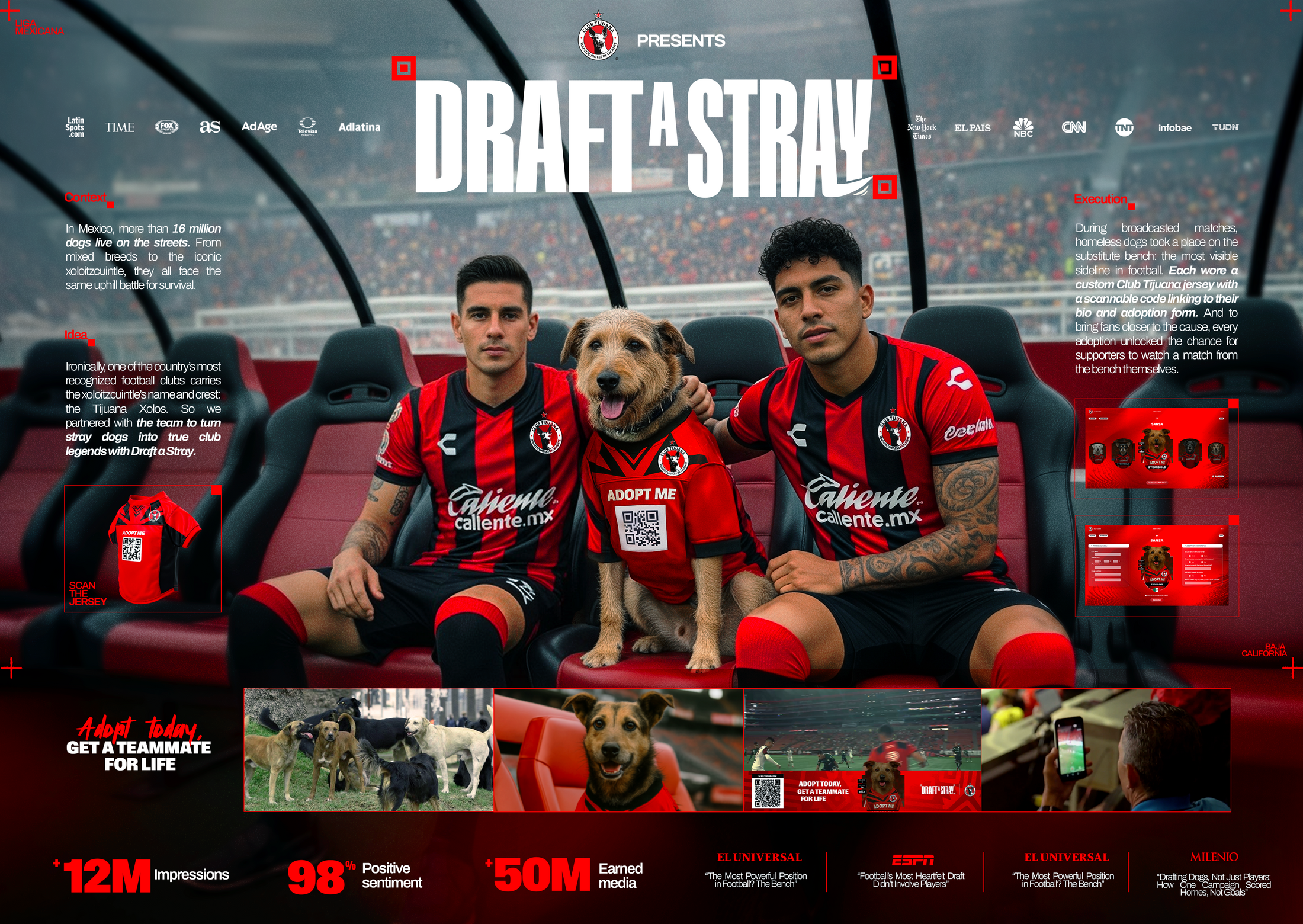 To change this, we created Draft a Stray: an initiative that gave homeless dogs the same spotlight as professional players. During one of the most-watched moments of a match, the substitute bench, stray dogs took their place alongside the team, wearing custom jerseys with scannable tags that connected fans directly to adoption forms.