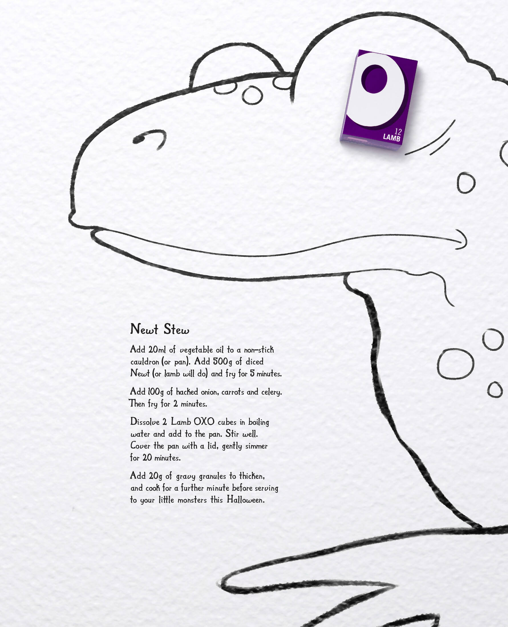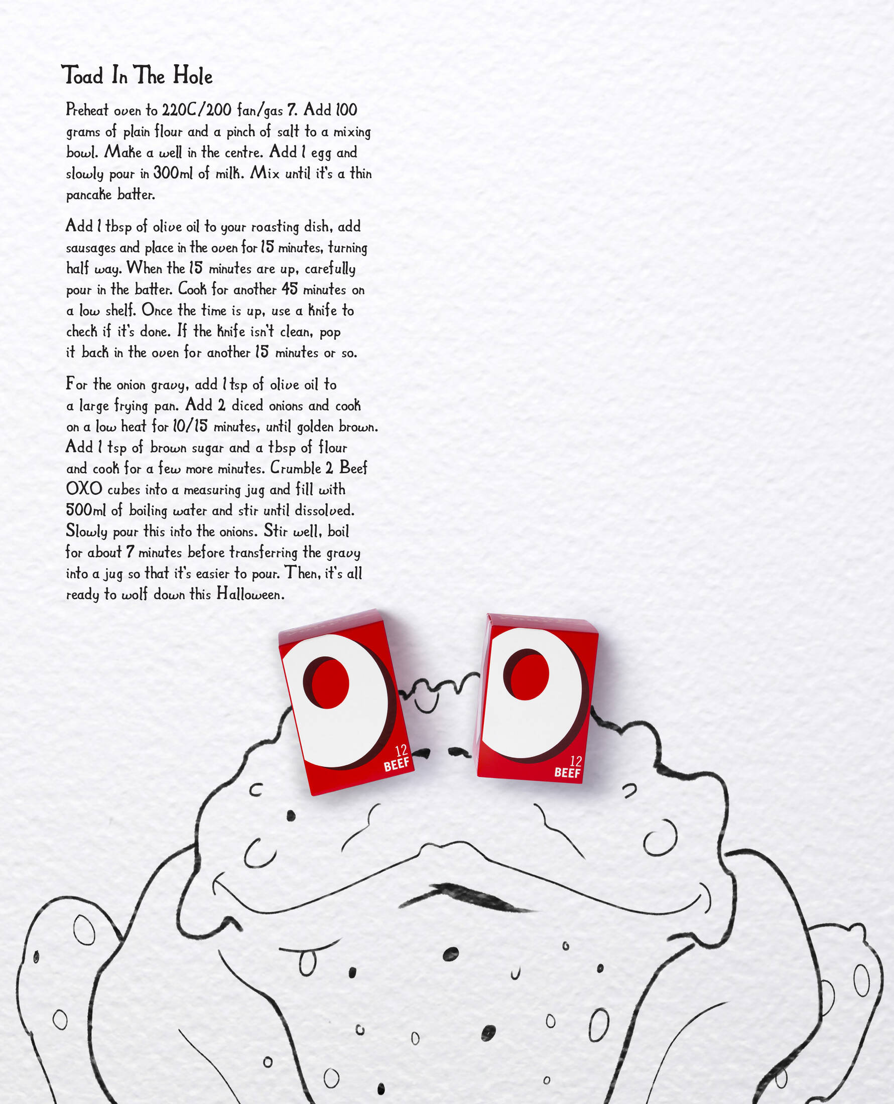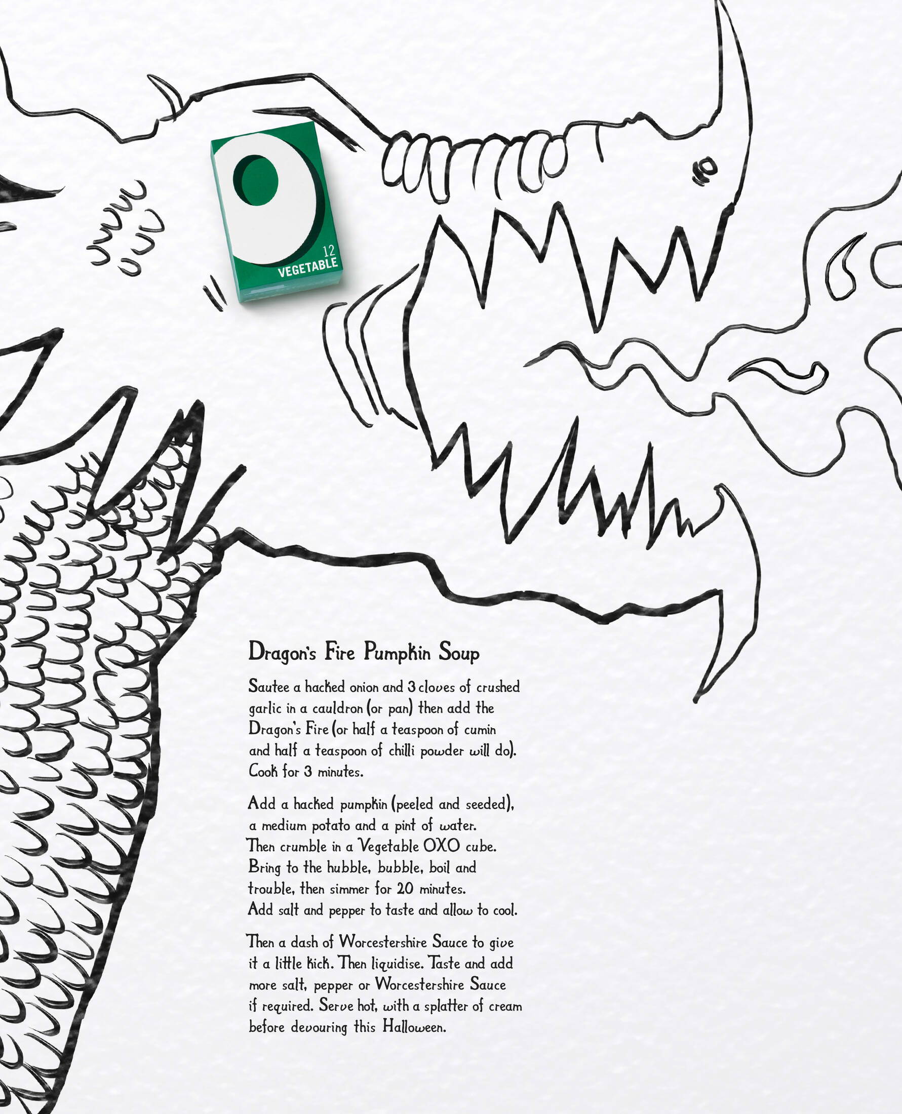 This professional campaign titled 'Dragon's fire pumpkin soup, Toad in the hole, Spicy bat w...' was published in United Kingdom in October, 2016. It was created for the brand: OXO, by ad agency: JWT. This Print medium campaign is related to the Food industry and contains 4 media assets. It was submitted about 9 years ago.