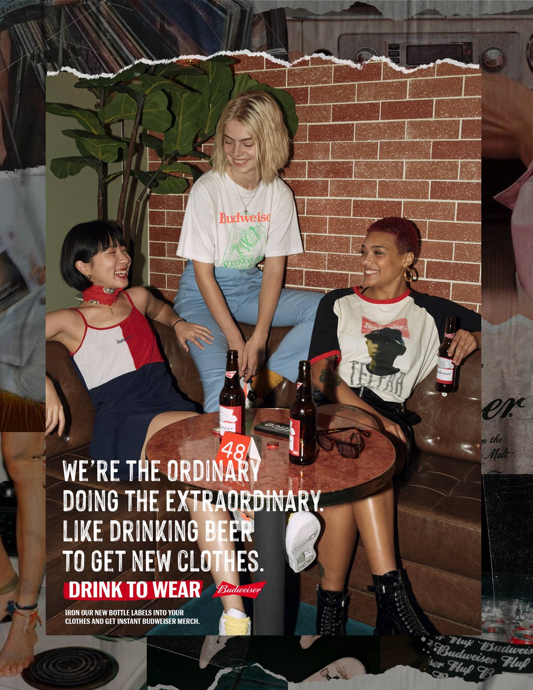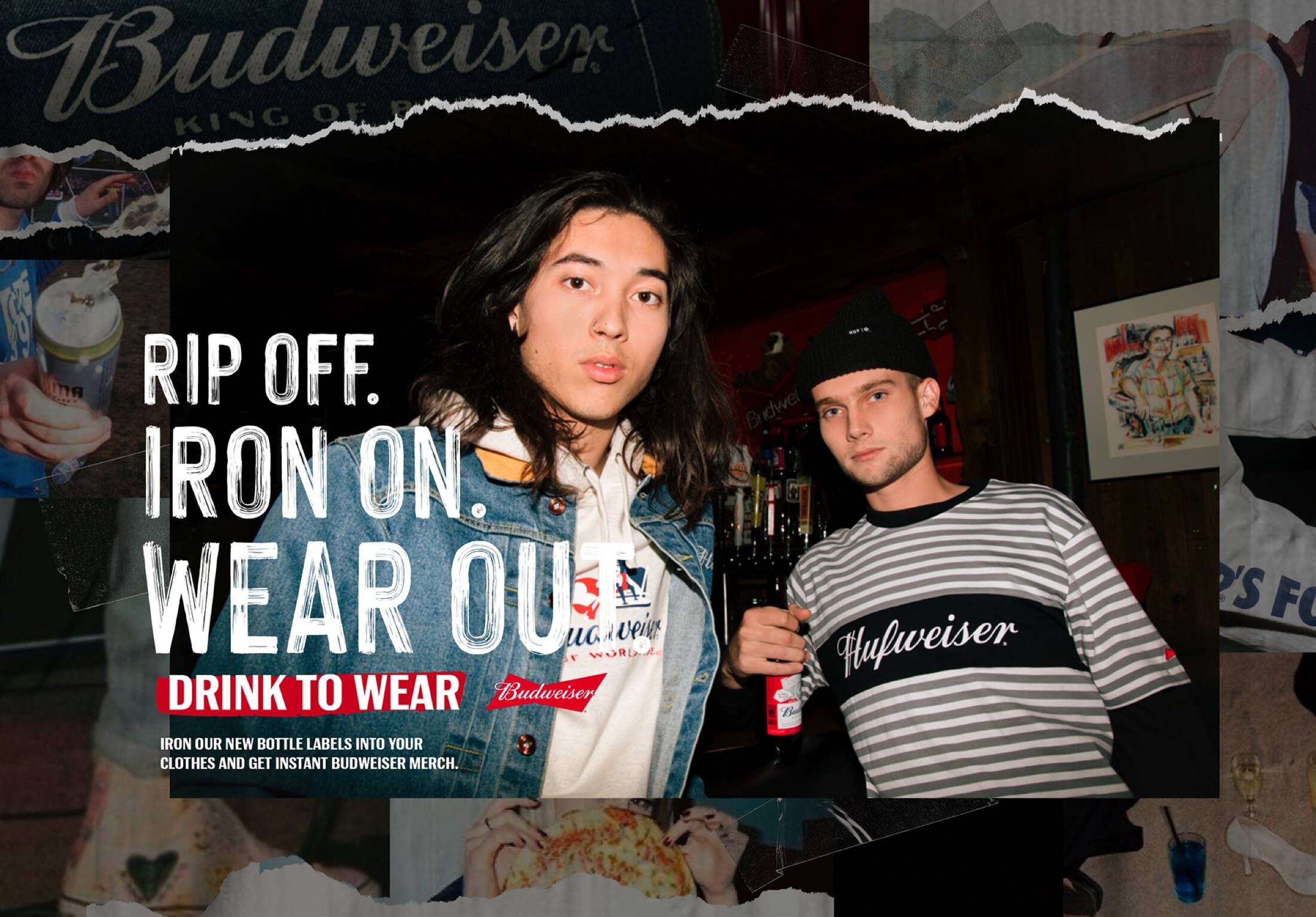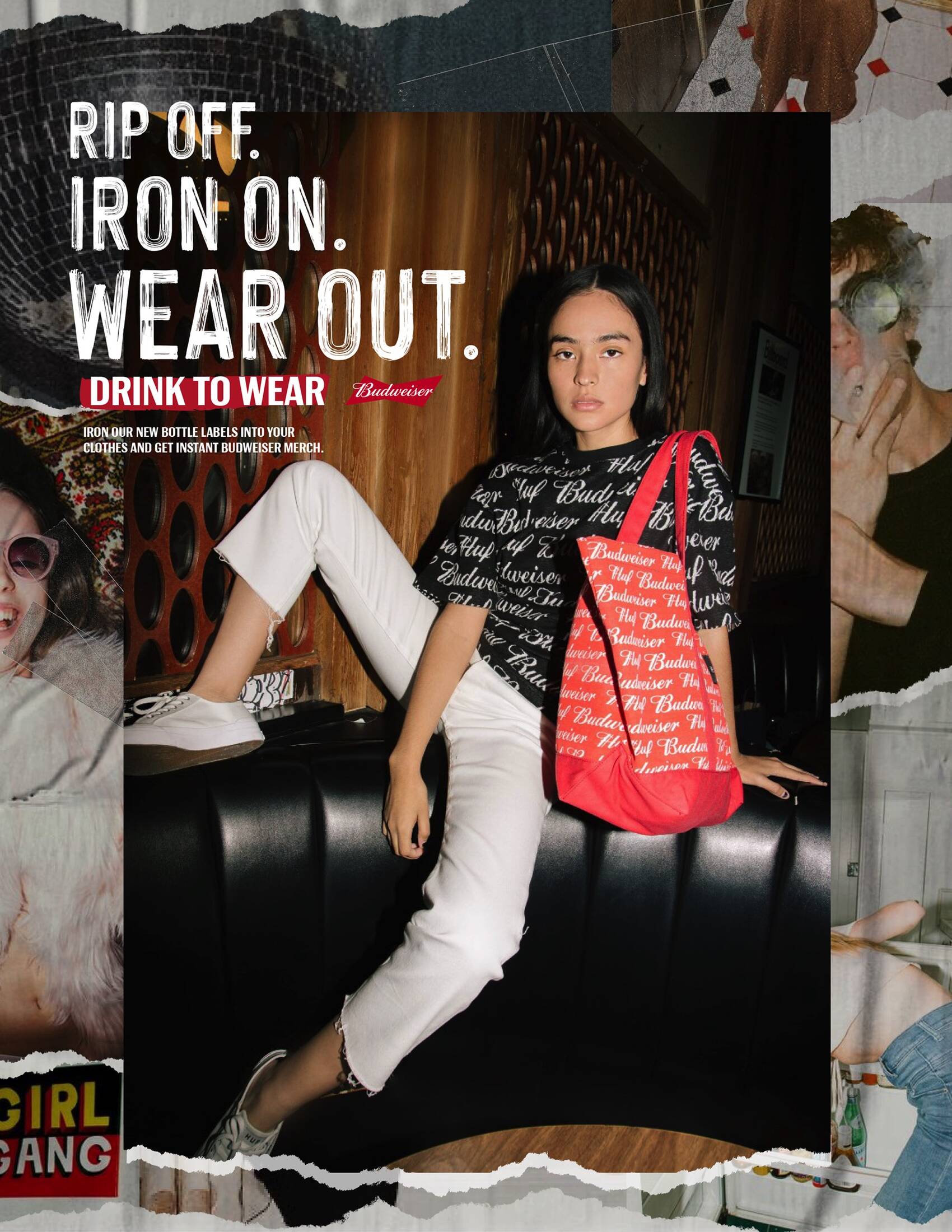 Young people like wearing Budweiser, but don't drink it. That's why we've created a special bottle edition where all the labels are made of iron-on transfer paper, so they can turn anything they want into Budweiser merch. Really, anything. It's time to go from wearing and not drinking, to doing both.