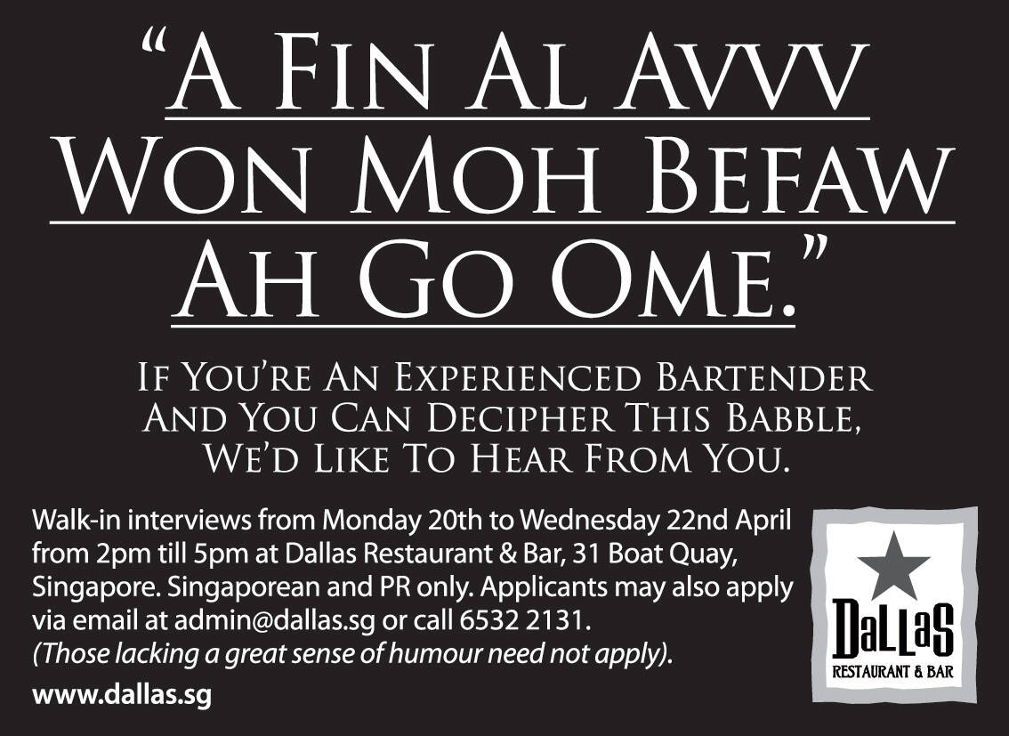 This professional campaign titled 'Drunken slur' was published in Singapore in April, 2009. It was created for the brand: Dallas Restaurant & Bar, by ad agency: Contagious. This Print medium campaign is related to the Recreation, Leisure industry and contains 1 media asset. It was submitted over 16 years ago.