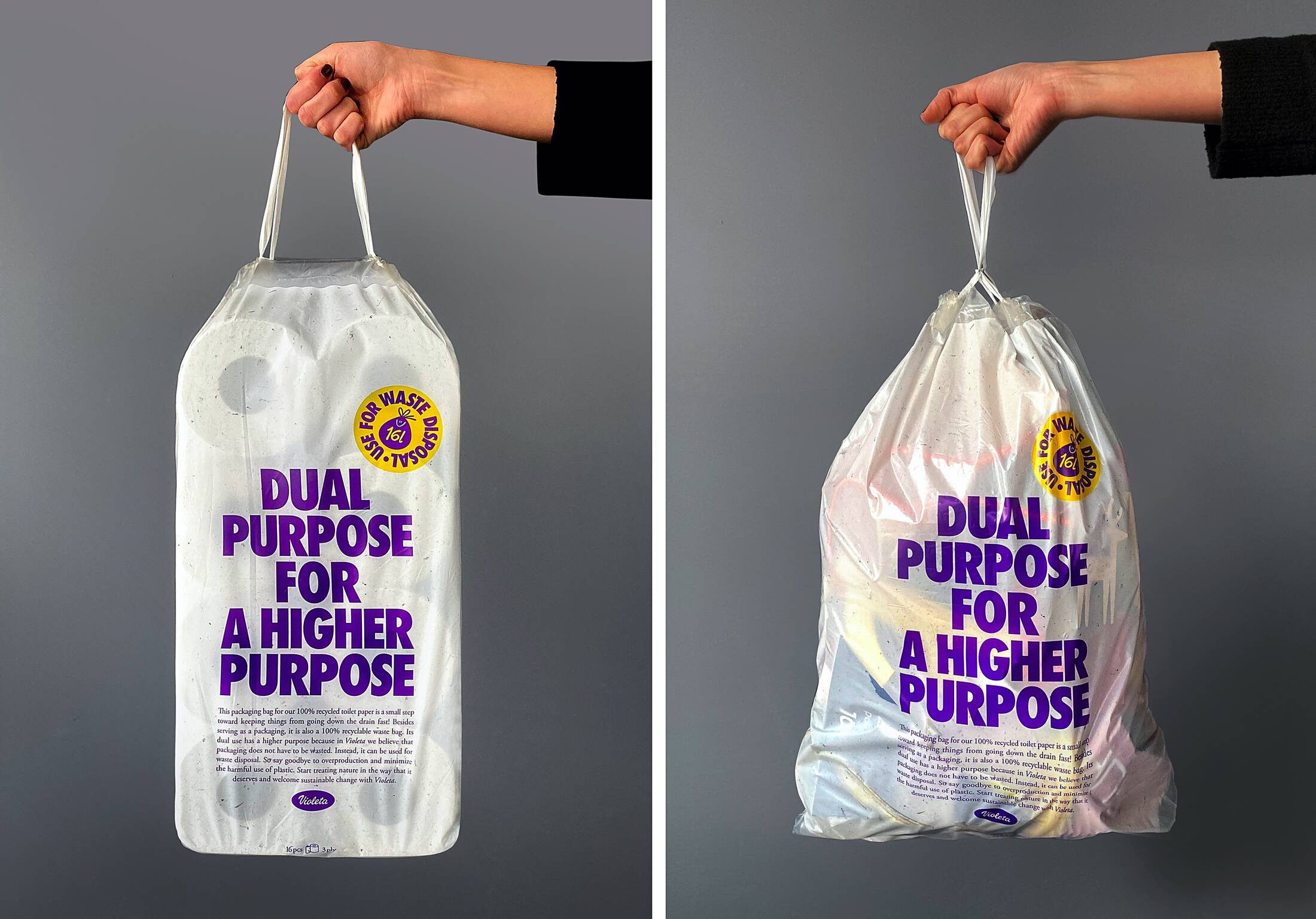 Amount of packaging waste that’s left behind by consumption is a serious threat to our environment. This packaging bag for our 100% recycled toilet paper is a small step toward keeping things from going down the drain fast! Besides serving as a packaging, it is also a 100% recyclable waste bag. Its dual use has a higher purpose because in Violeta we believe that packaging does not have to be wasted. Instead, it can be used for waste disposal. So say goodbye to overproduction and minimize the excessive and harmful use of plastic. We hope our project will inspire other brands to start rethinking how their own packaging can be designed in a more sustainable way and consumers to start thinking of possibilities to use all sorts of packaging as waste disposal bags, if possible. Start treating environment in the way that is deserves and welcome sustainable change by making small steps in responsible direction.
