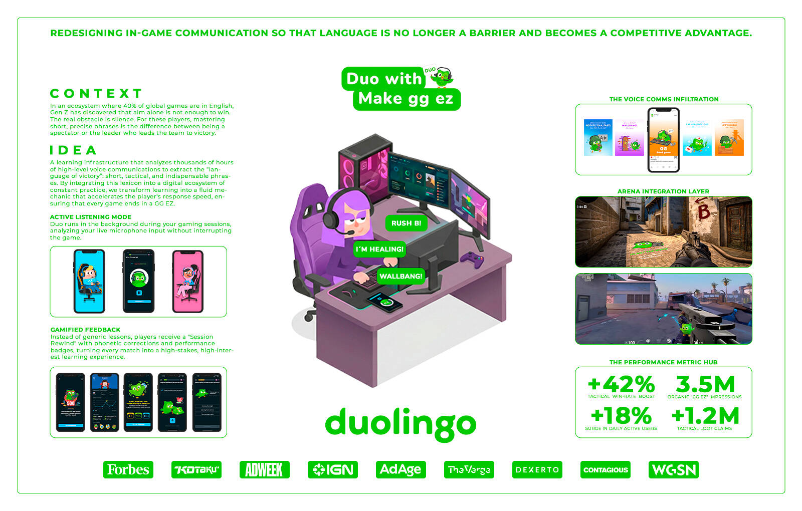 Duo with Duo is a learning infrastructure that transforms the battlefield into the ultimate language lab. By analyzing thousands of hours of high-level voice communications, we extract the "language of victory" to turn the competitive silence of 87% of Gen Z gamers into a real tactical advantage. Through real-time AI and in-game rewards, we make learning an essential buff so that every match ends with an GG EZ.