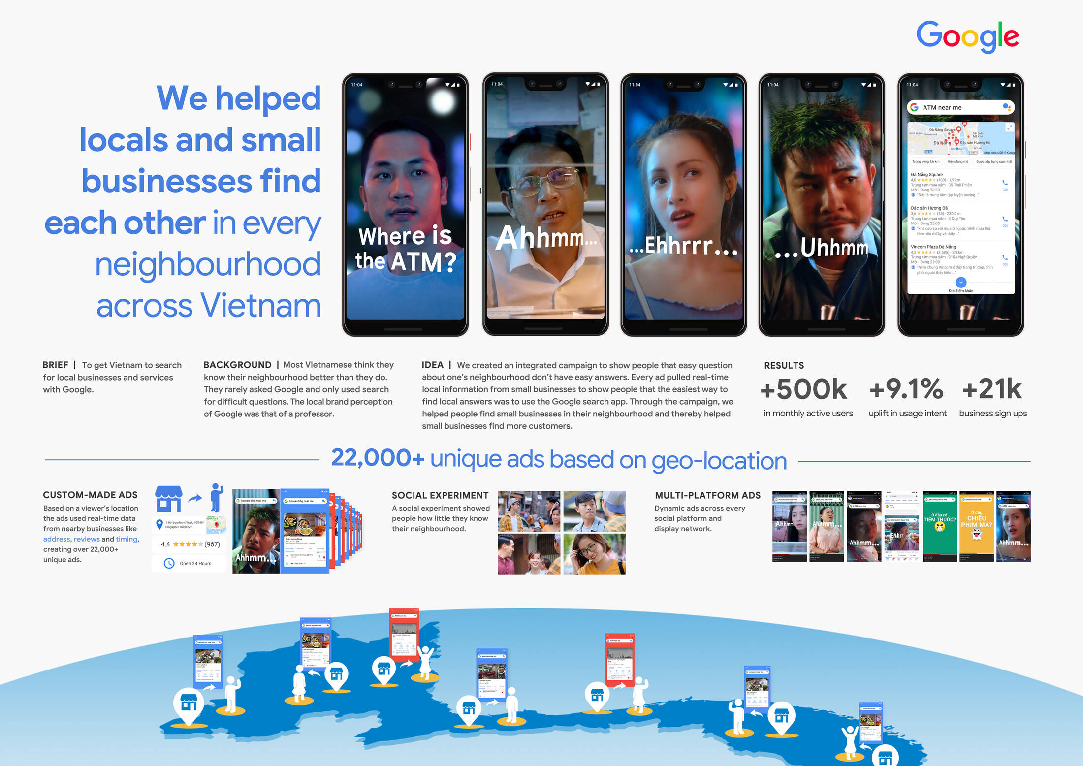 Most Vietnamese think they know their neighbourhood better than they do. They rarely asked Google and only used search for difficult questions. The local brand perception of Google was that of a professor. To solve this problem, Toaster, Singapore, created an integrated campaign to show people that easy question about one's neighbourhood don't have easy answers. Every ad pulled real-time local information from small businesses to show people that the easiest way to find local answers was to use the Google search app. Through the campaign, we helped people find small businesses in their neighbourhood and thereby helped small businesses find more customers
