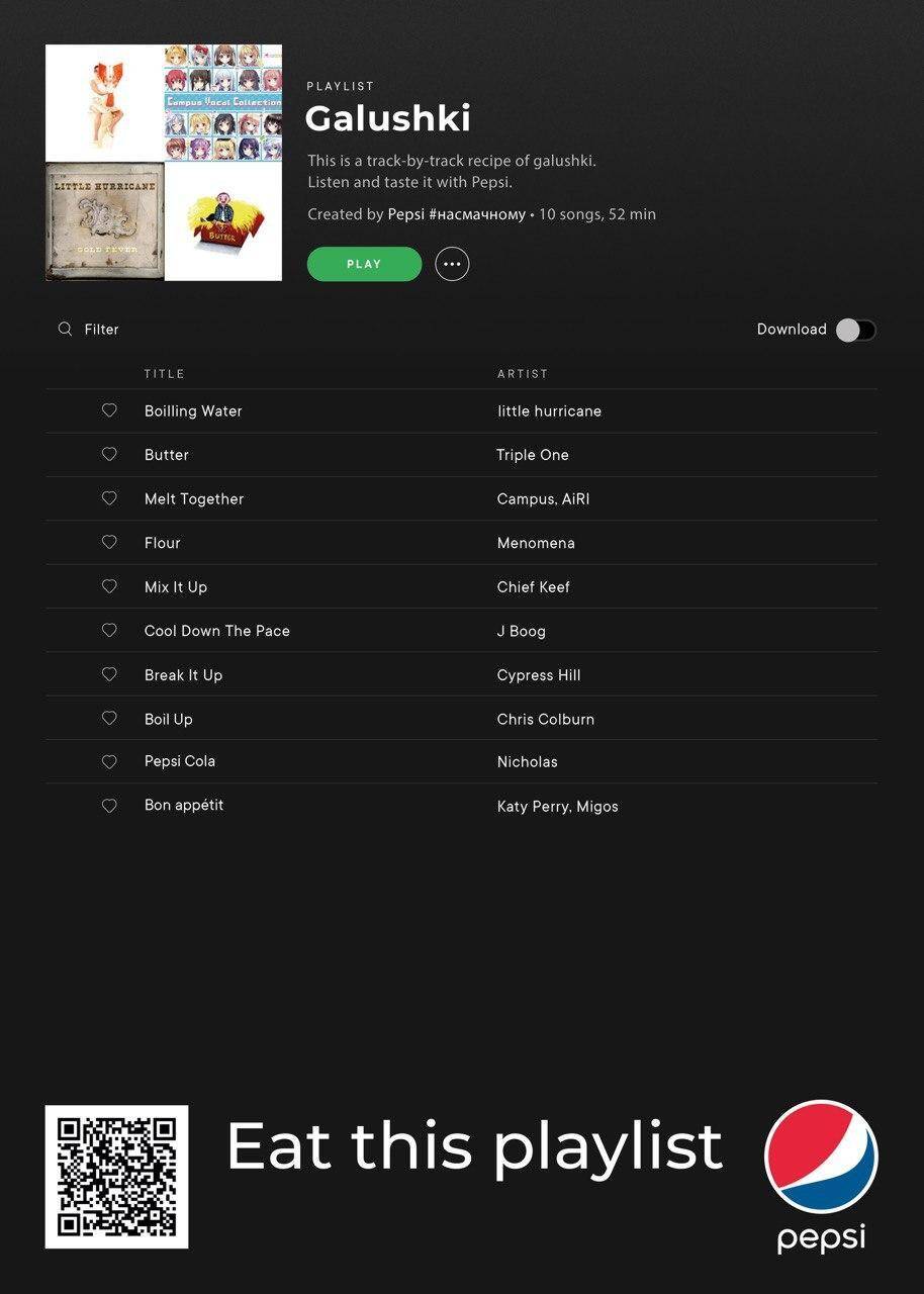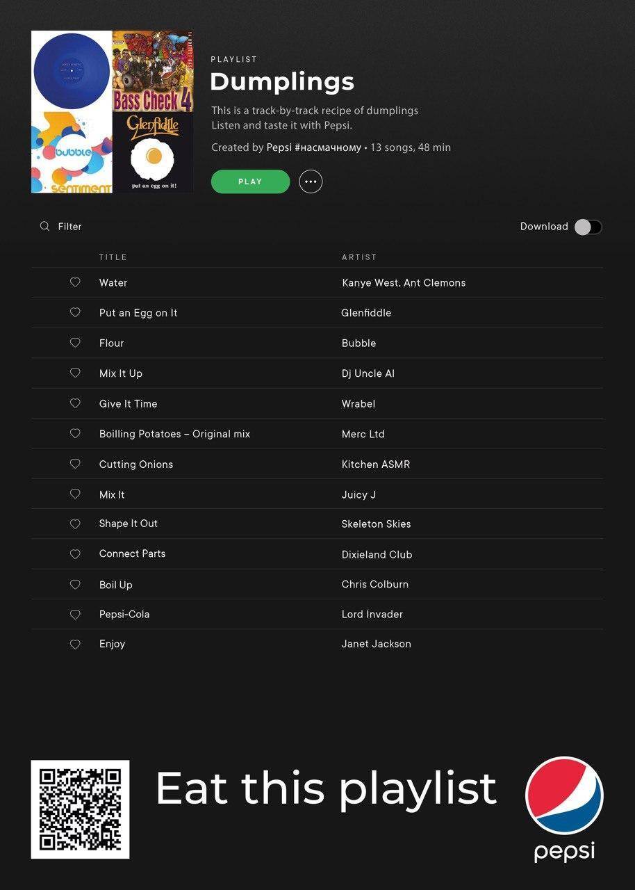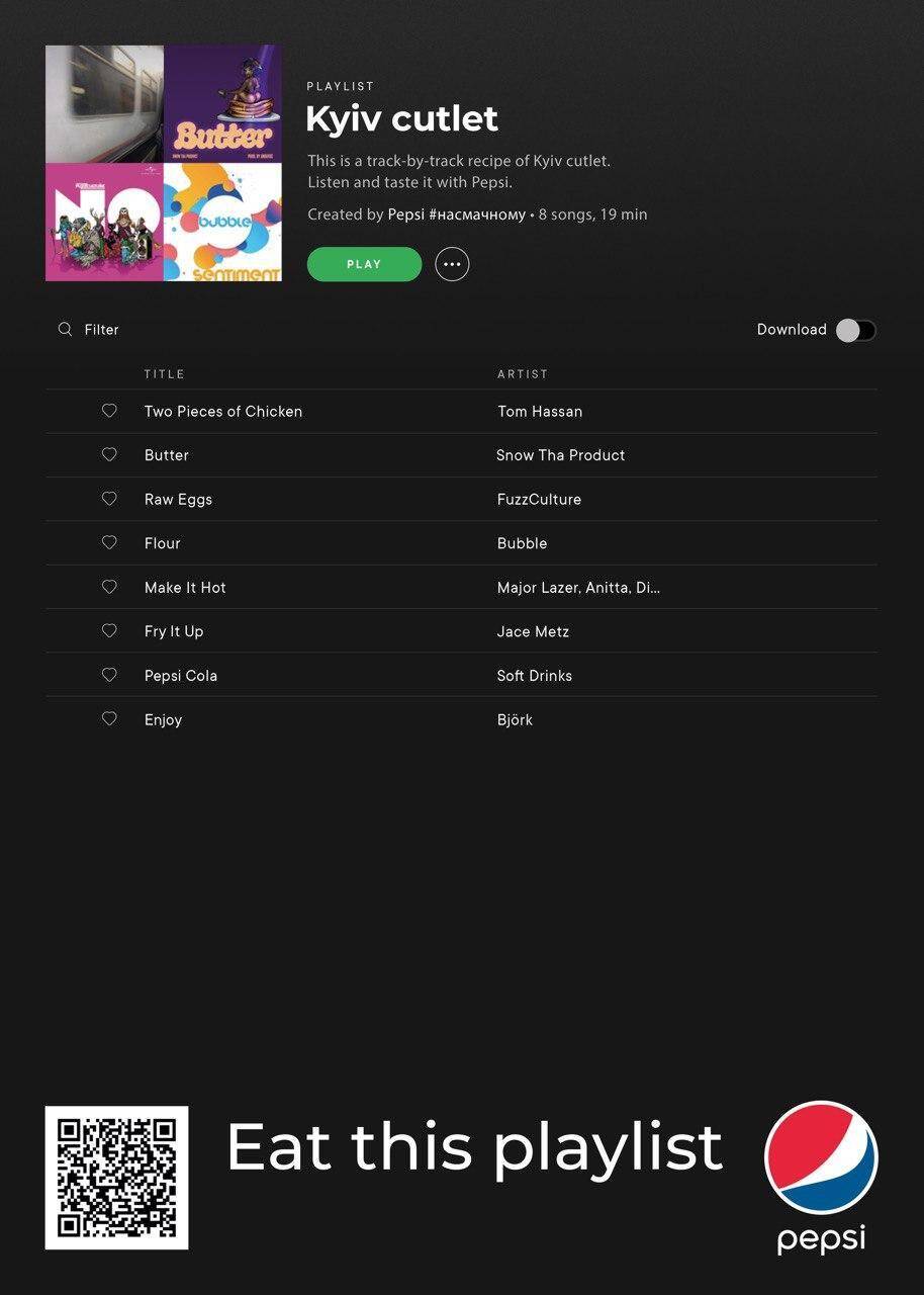This summer Spotify finally launched in Ukraine. We welcomed it with delicious playlists from Pepsi. You could get a recipe of traditional Ukrainian cuisine by reading each track-by-track listing. This approach combined Pepsi's music background and their strategy of getting the food territory. Series of posters include musical dumplings, galushki, and famous Kyiv cutlet so while quarantine has made it difficult to taste Ukrainian cuisine, you can still listen to it.