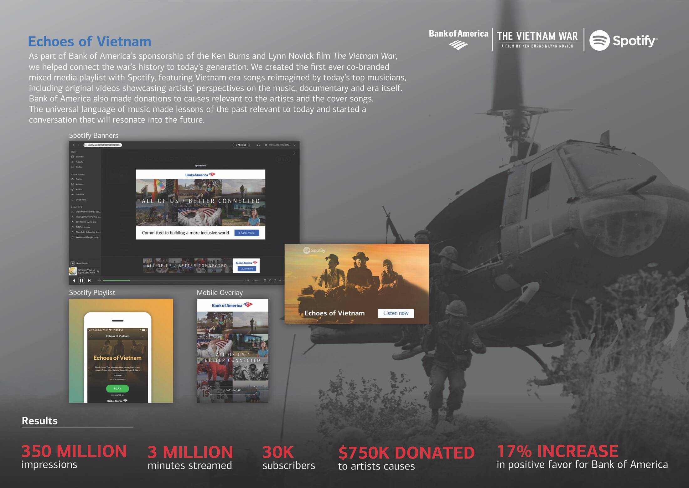 This professional campaign titled 'Echoes of Vietnam' was published in United States in September, 2017. It was created for the brand: Bank of America, by ad agency: Publicis. This Integrated medium campaign is related to the Finance industry and contains 2 media assets. It was submitted almost 7 years ago.