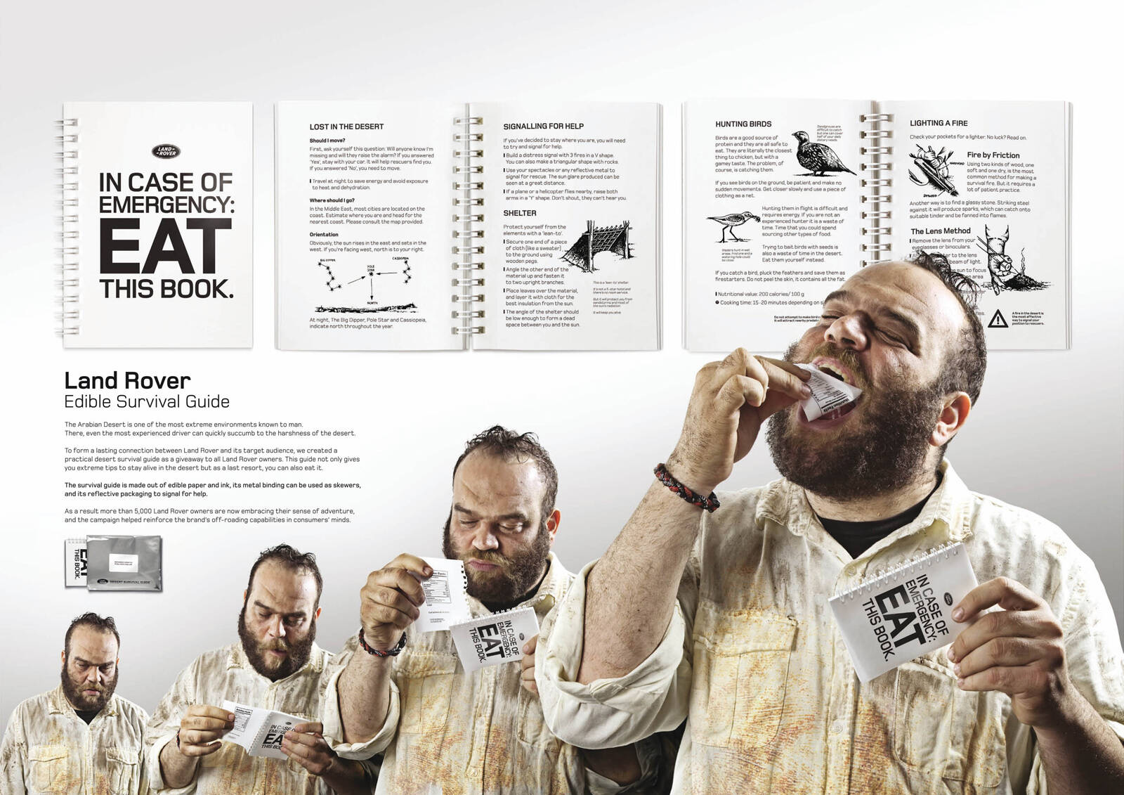 While Land Rover vehicles can take on any obstacles in the desert, it cannot be said the same of their owners. Scorching temperatures, deadly animals and sinkholes are just a few things they might encounter. And when they venture deep into it, even the most experienced drivers can quickly succumb to the harshness of the desert. We wanted to create something that would cut through the clutter and that these people would like to keep. So we created a survival guide, which explained the basics for staying alive in the Arabian Desert, and packaged it in a way that would spur the attention of our target audience. We researched every indigenous animal and plant, people could encounter in the Arabian Desert and how they could be used to survive. We studied the topography of the region to guide people to safety. We used a reflective packaging similar to army rations, which could be used to signal for help, and bound the book with a metal spiral, which could be used for cooking. Finally, we even took an extra step so that in case of emergency, people could always EAT the book. It was made out of edible ink and paper, and it had a nutritional value close to that of a cheeseburger. We sent the book to 5,000 existing customers, gave it away as a supplement to the cars’ manual and made it freely available in sports shops. The initial response was very positive. And the client was so happy with the concept that they asked us to include the book as an insert in the next edition of a car magazine, with a 70,000 circulation.