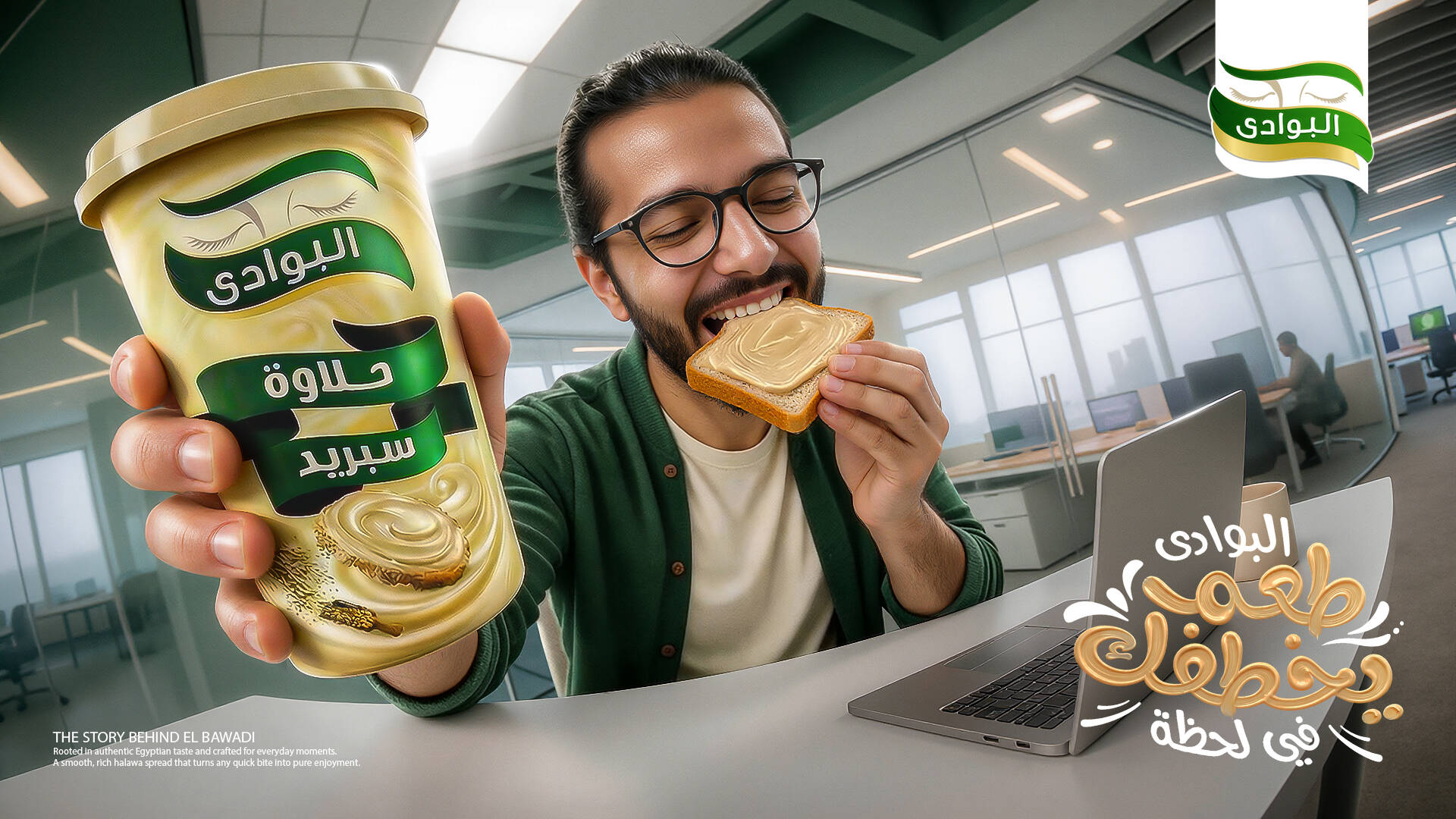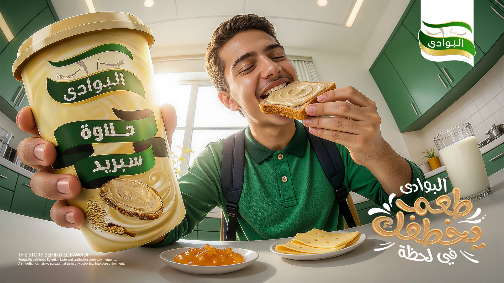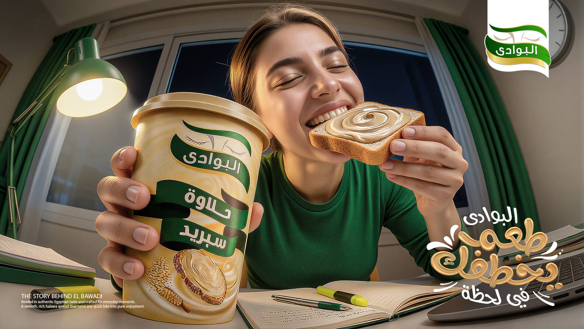 Speculative social-first FMCG campaign for El Bawadi Halawa Spread, built around everyday hunger moments and a signature closed-eye expression that signals pure enjoyment. The project combines low-angle fisheye hero shots, AI execution, and refined retouching to create a scroll-stopping visual system.