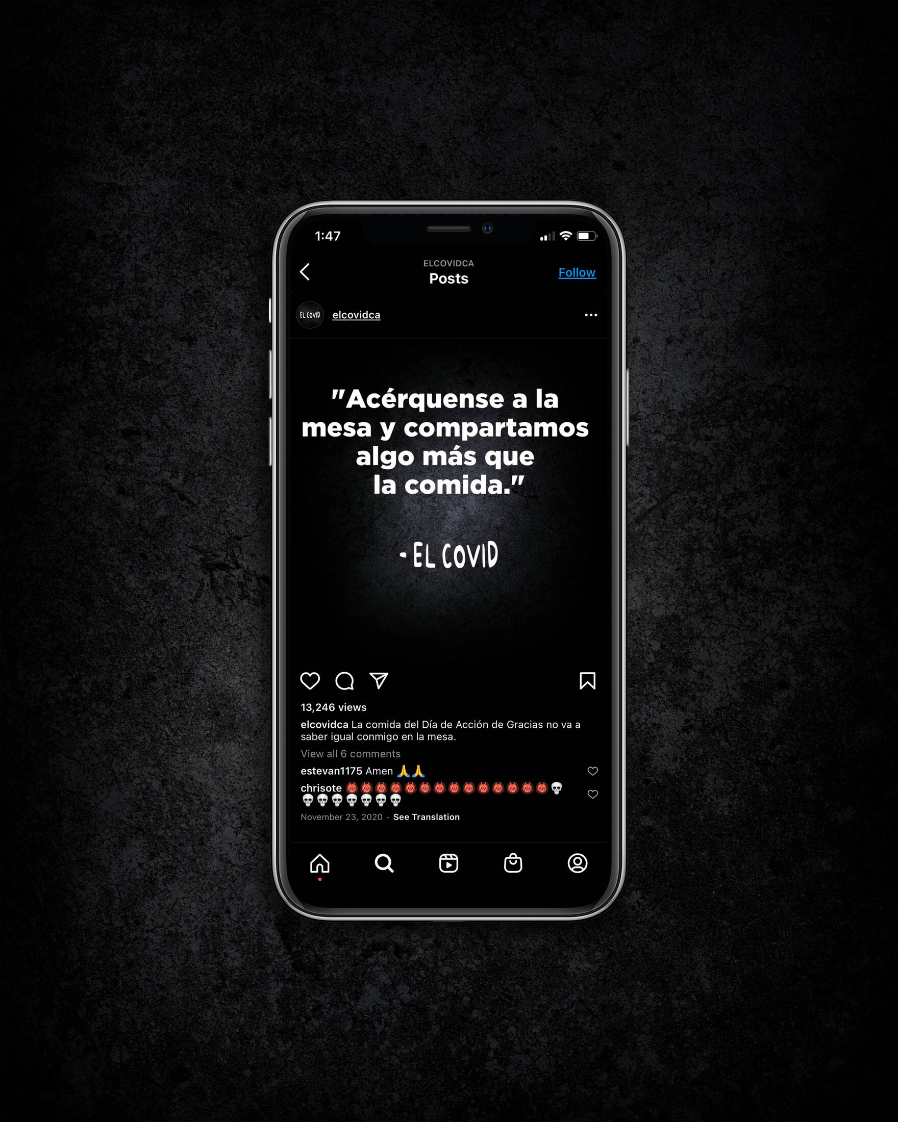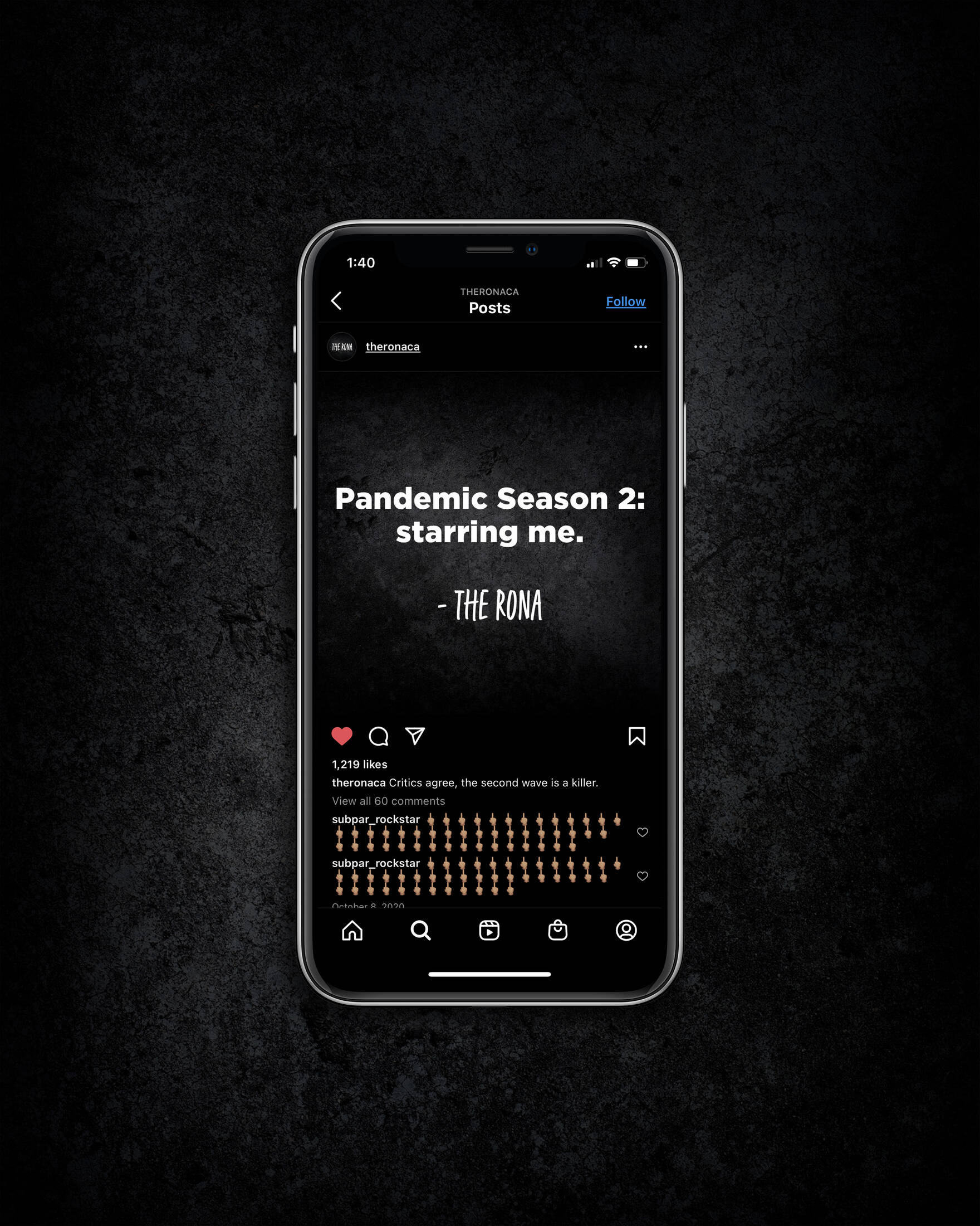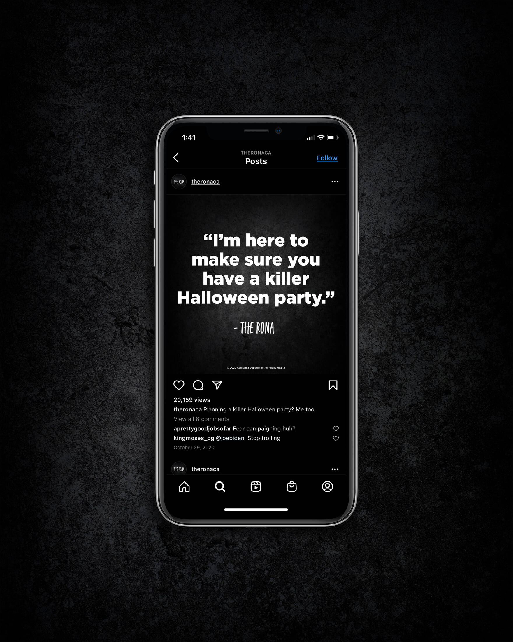 To help combat the spread of COVID-19 in California, we created a daring campaign aimed to shift the behavior of at-risk Latinos and African Americans. Rarely do we get to write villains into brand stories, but for a matter of life and death, we summoned El Covid and The Rona, our campaign's sarcastic, playful and mildly sinister characters. They proved to touch upon cultural markers for our segments, leveraging language and idioms our audience would relate to.