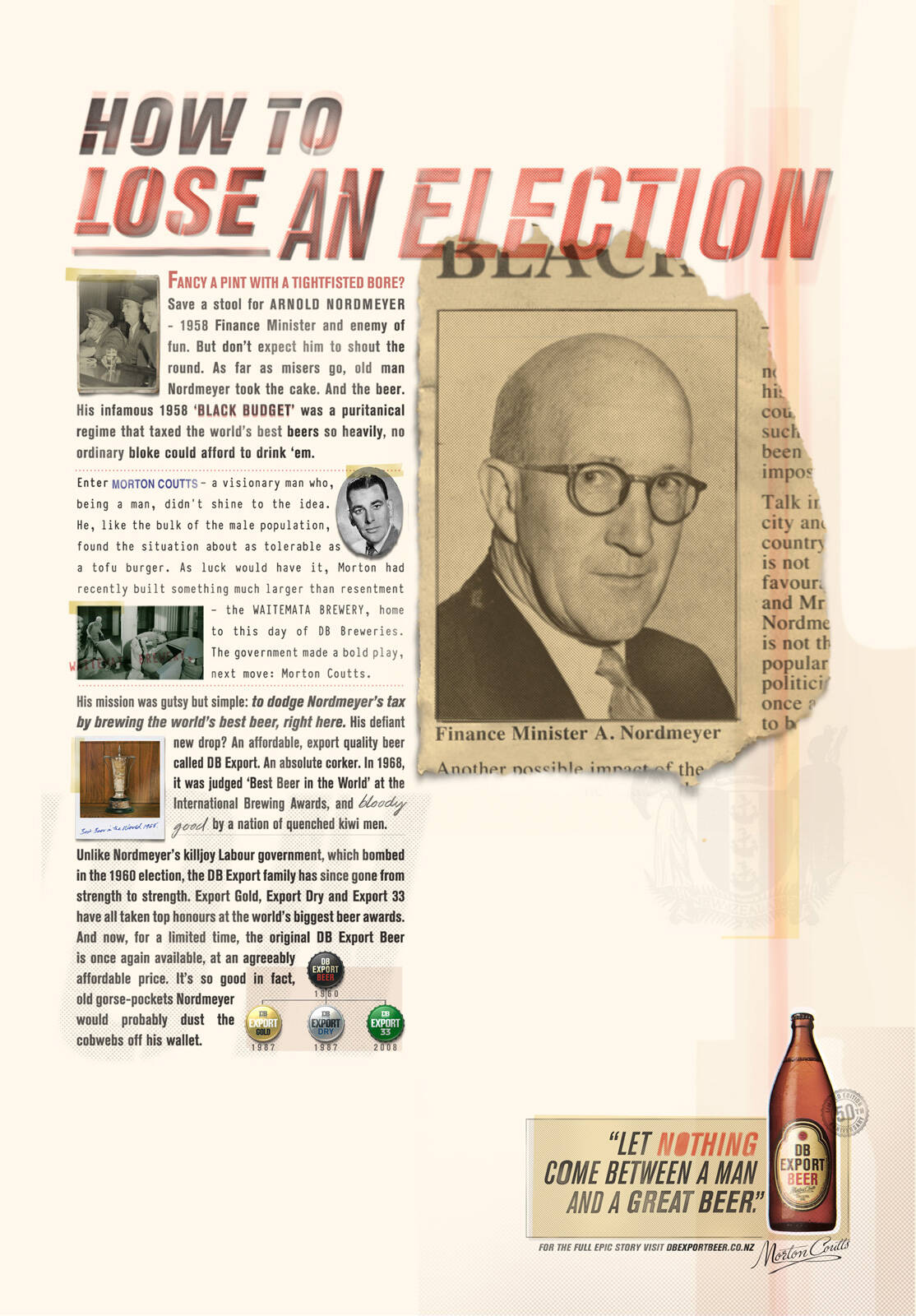 This professional campaign titled 'Election, Invention, Paper Route, Brown Paper Bag' was published in New Zealand in November, 2010. It was created for the brand: DB Export Beer, by ad agency: BBDO. This Print medium campaign is related to the Alcoholic Drinks industry and contains 4 media assets. It was submitted almost 15 years ago.