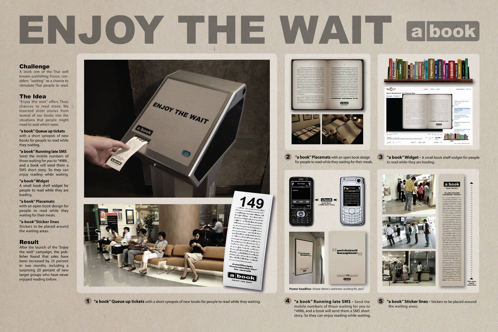 This professional campaign titled 'Enjoy the wait' was published in Thailand in October, 2010. It was created for the brand: A book, by ad agency: BBDO. This Ambient medium campaign is related to the Media industry and contains 1 media asset. It was submitted about 15 years ago.
