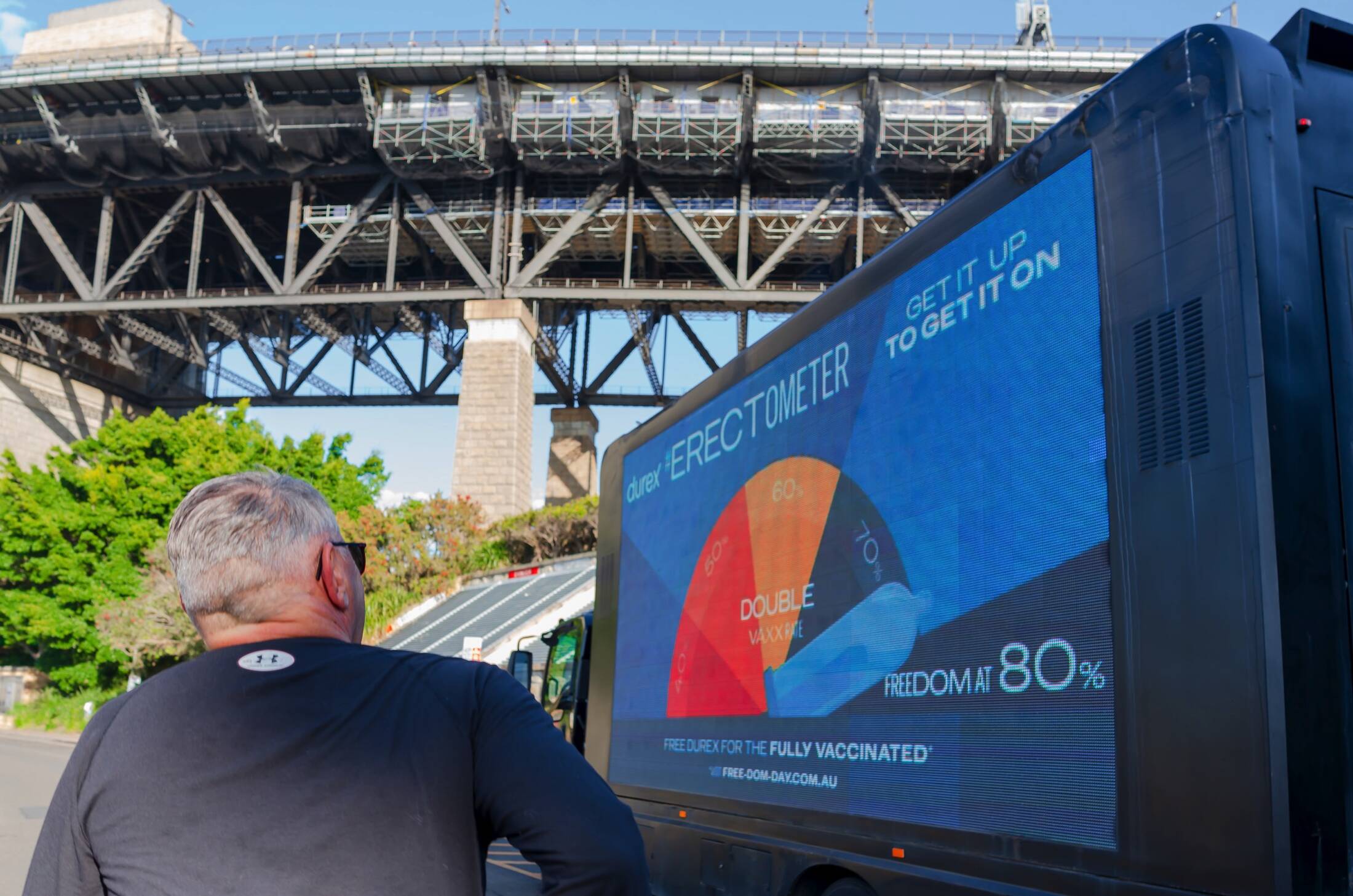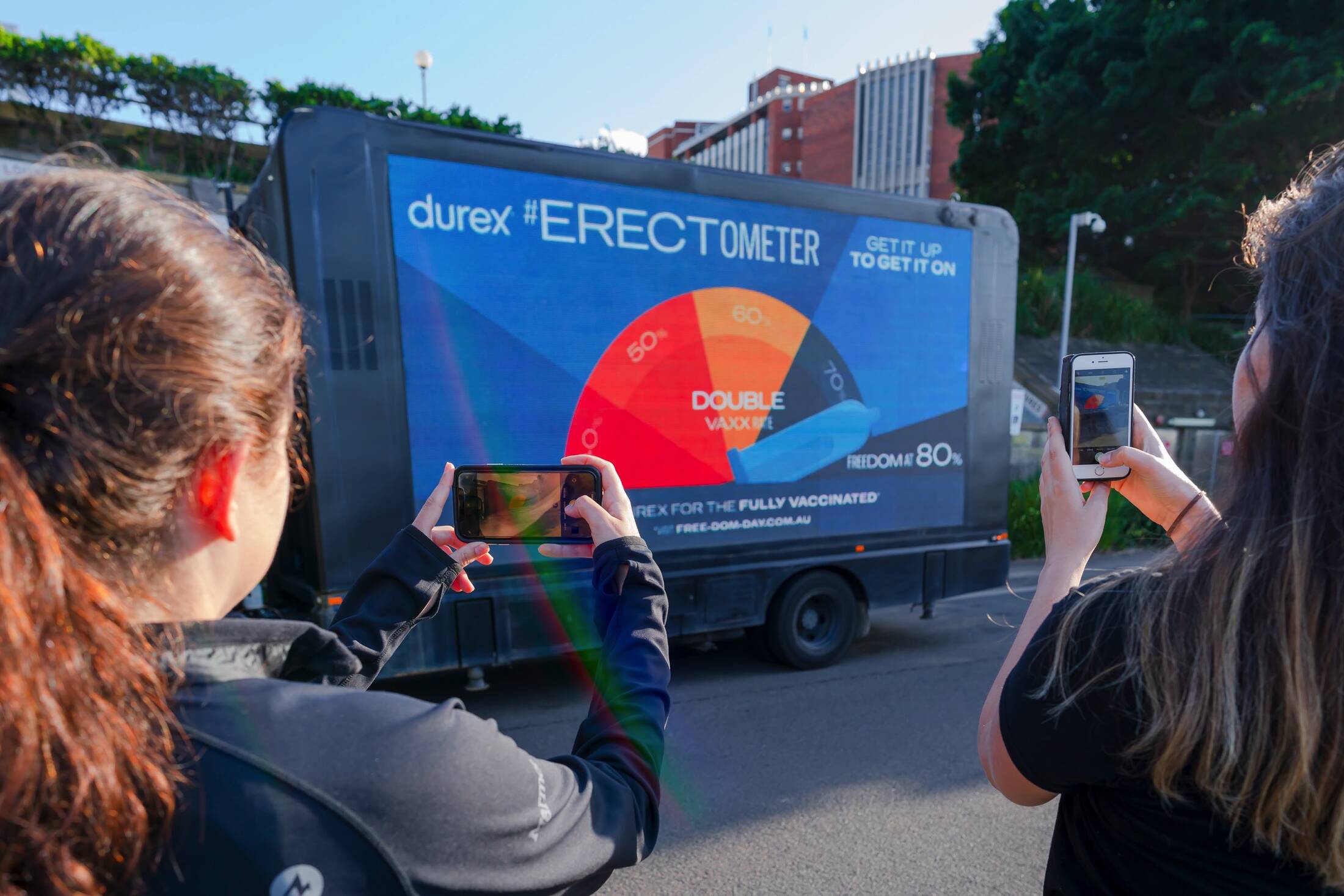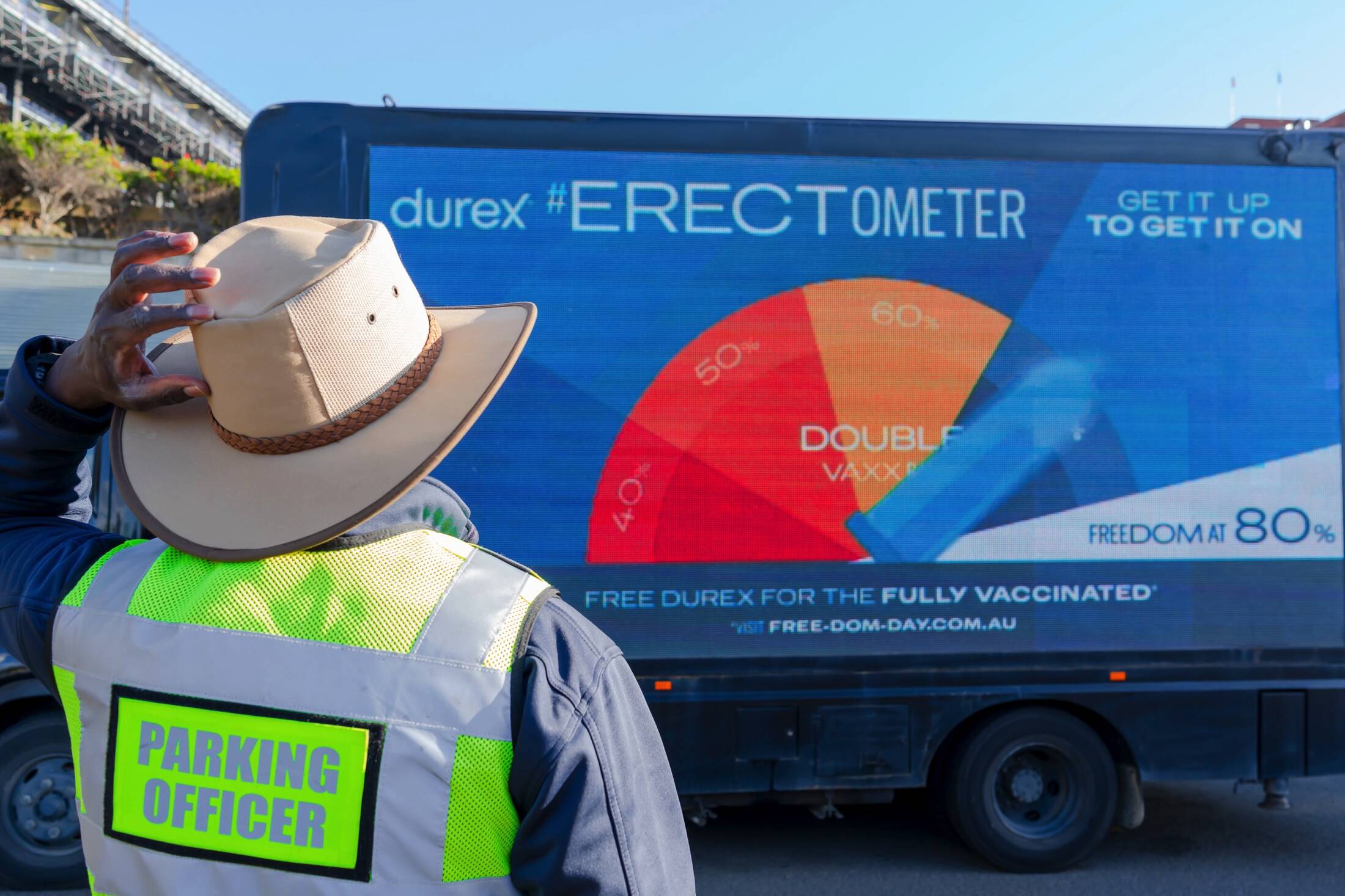 The #Erectometer displays real-time New South Wales vaccination data while enjoying a three-day romp around Sydney, stopping off at locations along the city’s cheekiest ‘root’, pulling into Homebush, Rooty Hill, Balls Head, Pleasure Point and more. Rising and pointing to key vaccination milestones, the Erectometer’s erect Durex condom will reach vax climax once 80% of residents are double-jabbed.