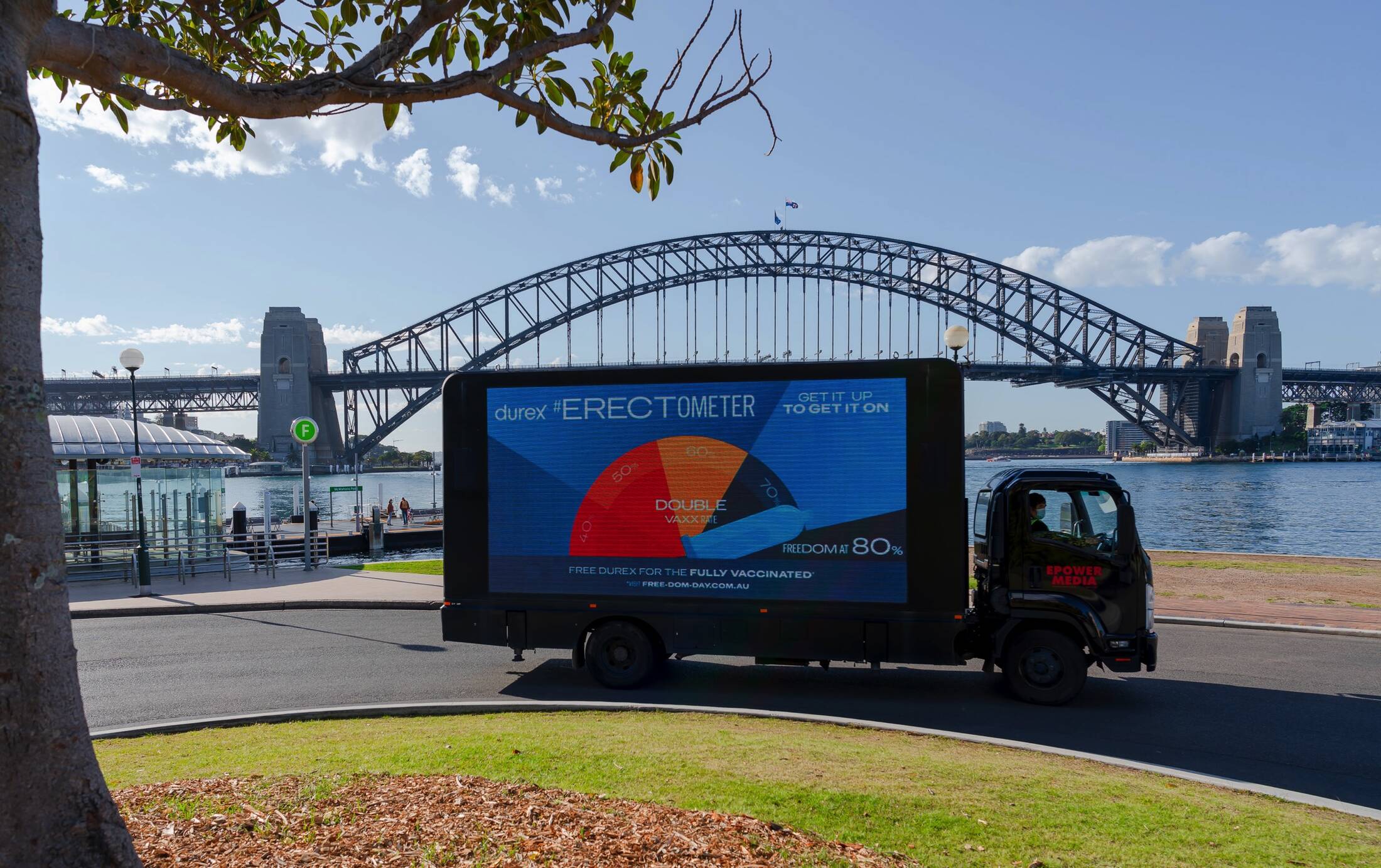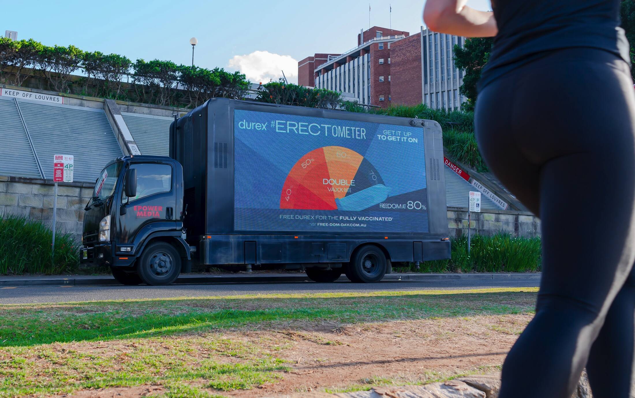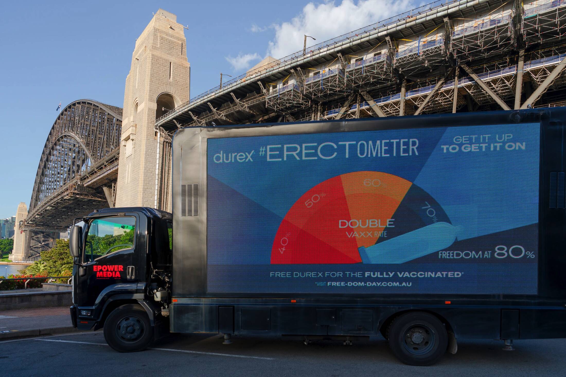 The #Erectometer displays real-time New South Wales vaccination data while enjoying a three-day romp around Sydney, stopping off at locations along the city’s cheekiest ‘root’, pulling into Homebush, Rooty Hill, Balls Head, Pleasure Point and more. Rising and pointing to key vaccination milestones, the Erectometer’s erect Durex condom will reach vax climax once 80% of residents are double-jabbed.