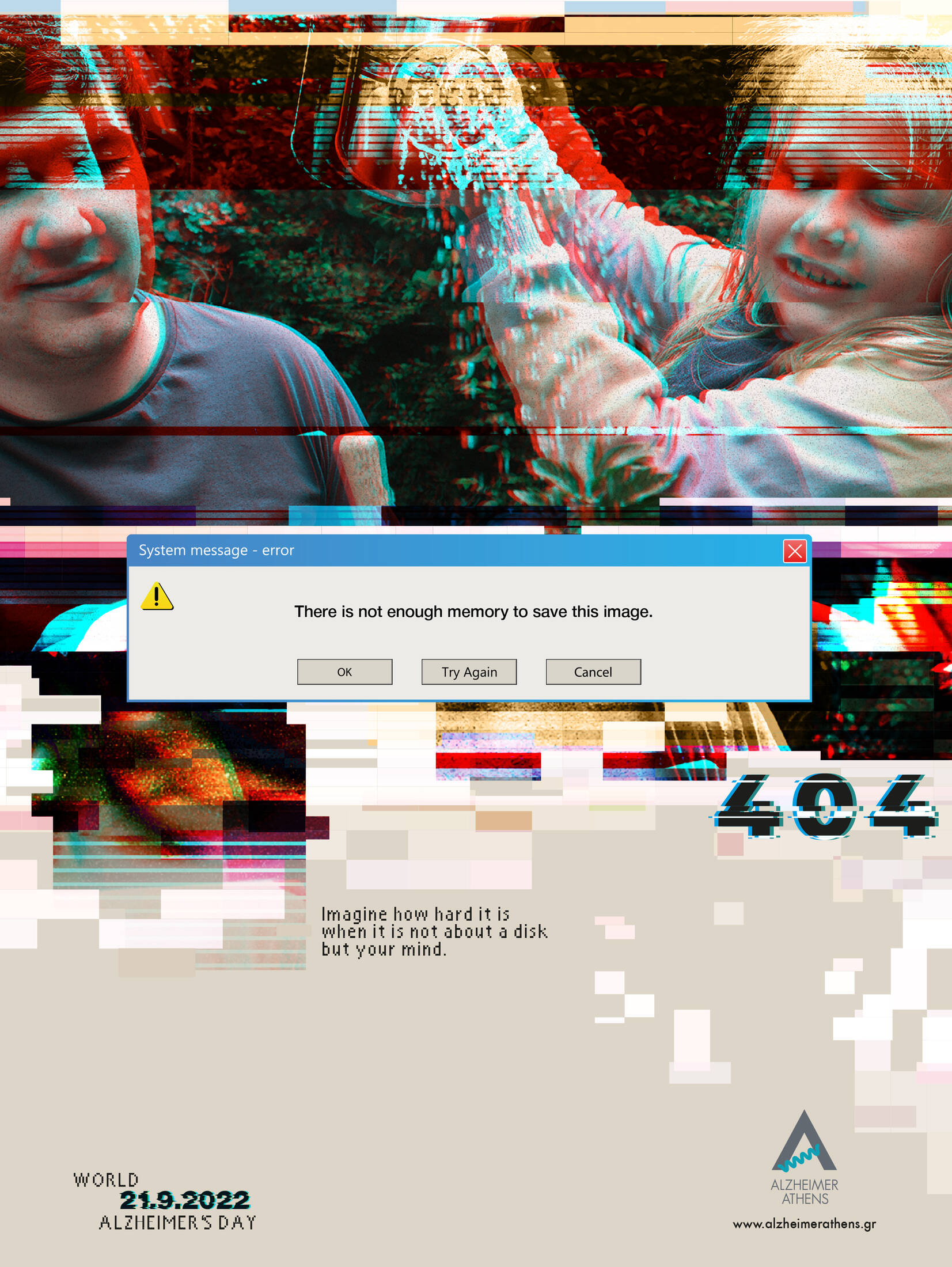We use technology to "save" moments of our lives forever by keeping them in some computer's memory. We take for granted that systems work correctly every time, and our balance is unimaginably disturbed when we receive error messages about insufficient memory to complete some process. A not enough memory error message for World Alzheimer's Day 2022 reminds us of how hard it is when one cannot rely any more on the most advanced system, that of the human brain, and the bitter metaphor makes us aware of the difficult lives of our fellow human beings, who struggle daily with some form of dementia.