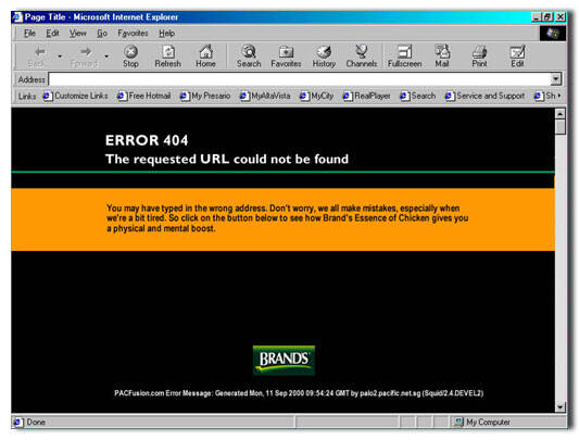 This professional campaign titled 'Error 3/3, Error 2/3, Error 1/3' was published in Singapore in September, 2005. It was created for the brand: Brand's, by ad agency: Ogilvy. This Digital medium campaign is related to the Pharmaceutical industry and contains 3 media assets. It was submitted about 20 years ago.