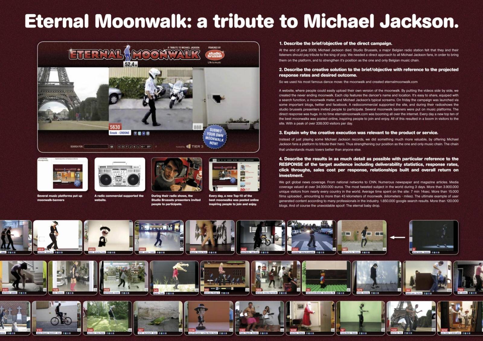 Creative Execution: Instead of just playing some Michael Jackson records, we did something much more valuable, by offering Michael Jackson fans a platform to tribute their hero. Thus strengthening our position as the one and only music chain. The chain that understands music lovers better than anyone else. Describe the creative solution to the brief/objective. So we used his most famous dance move: the moonwalk and created eternalmoonwalk.com A website, where people could easily upload their own version of the moonwalk. By putting the videos side by side, we created the never ending moonwalk. On friday the campaign was launched via some important blogs, Twitter and Facebook. A radiocommercial supported the site, and during their radioshows the studio brussels presenters invited people to participate. Several moonwalk banners were put on music platforms. Every day a new top ten of the best moonwalks was posted online. The direct response was huge.