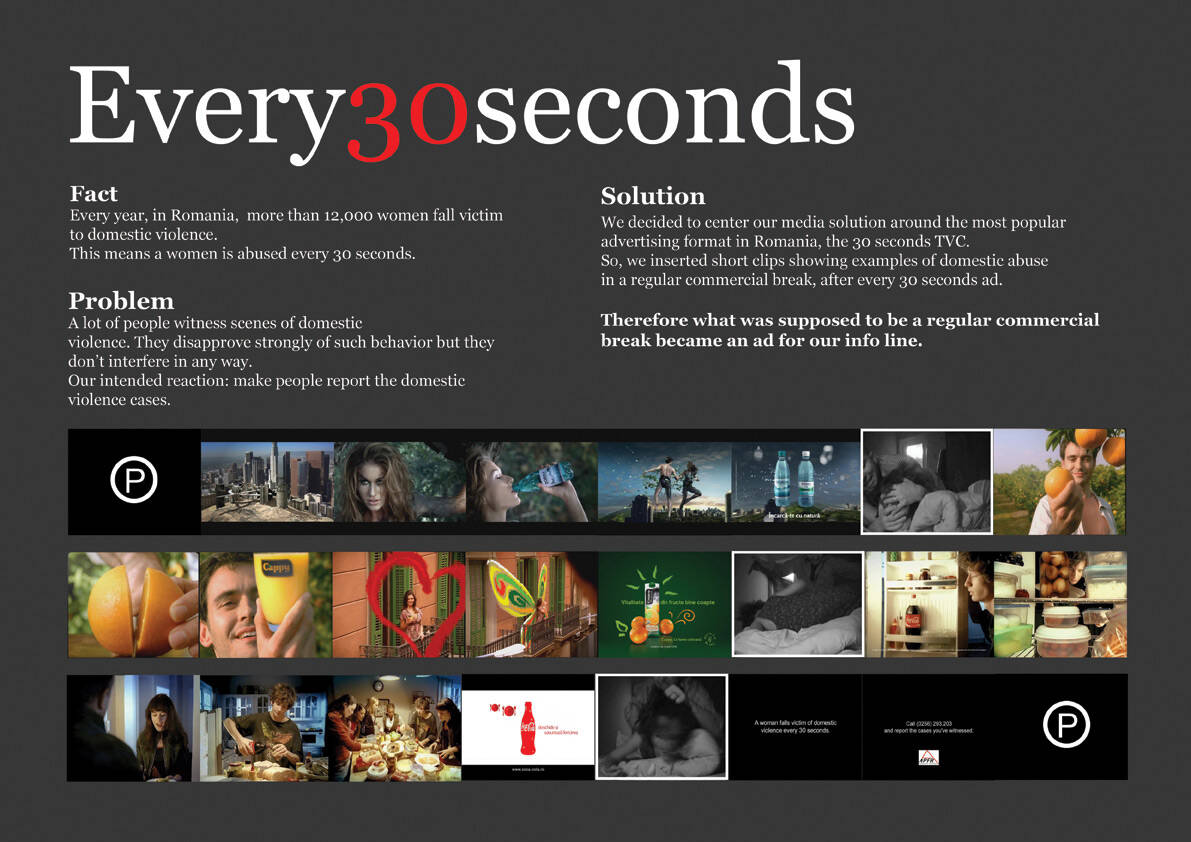 This professional campaign titled 'Every 30 seconds' was published in Romania in August, 2009. It was created for the brand: Romanian Association for Promoting Women’s Rights, by ad agency: McCann. This Film medium campaign is related to the Public Interest industry and contains 1 media asset. It was submitted over 16 years ago.