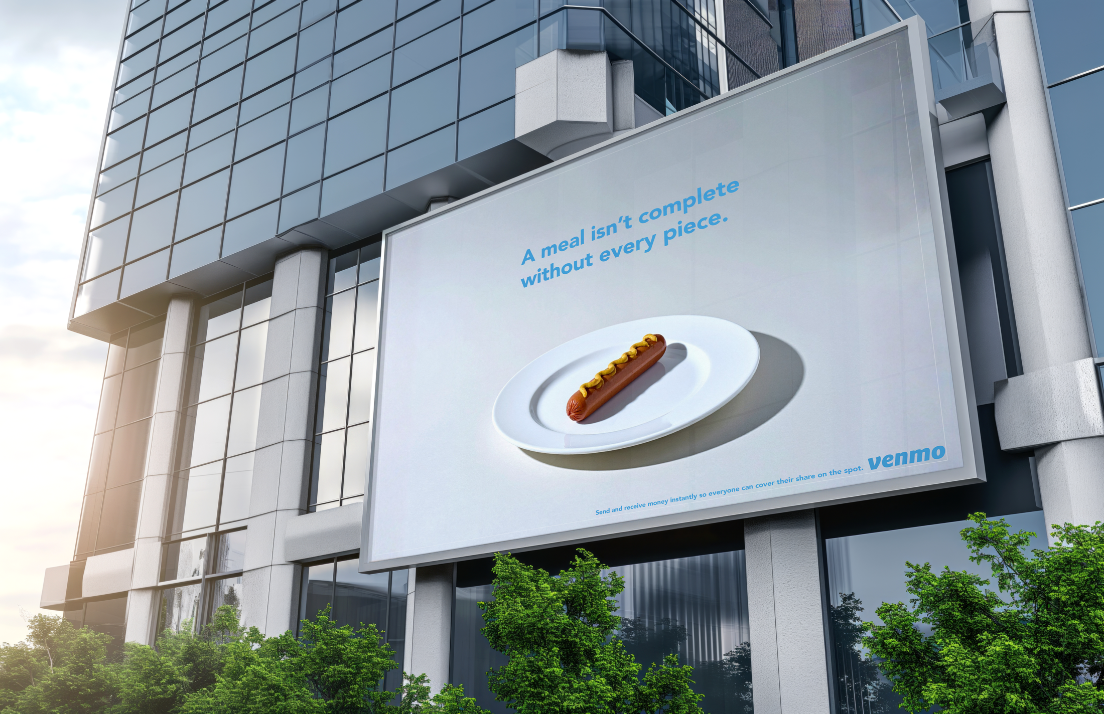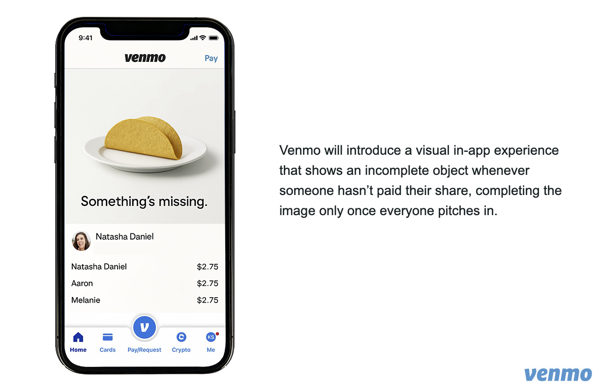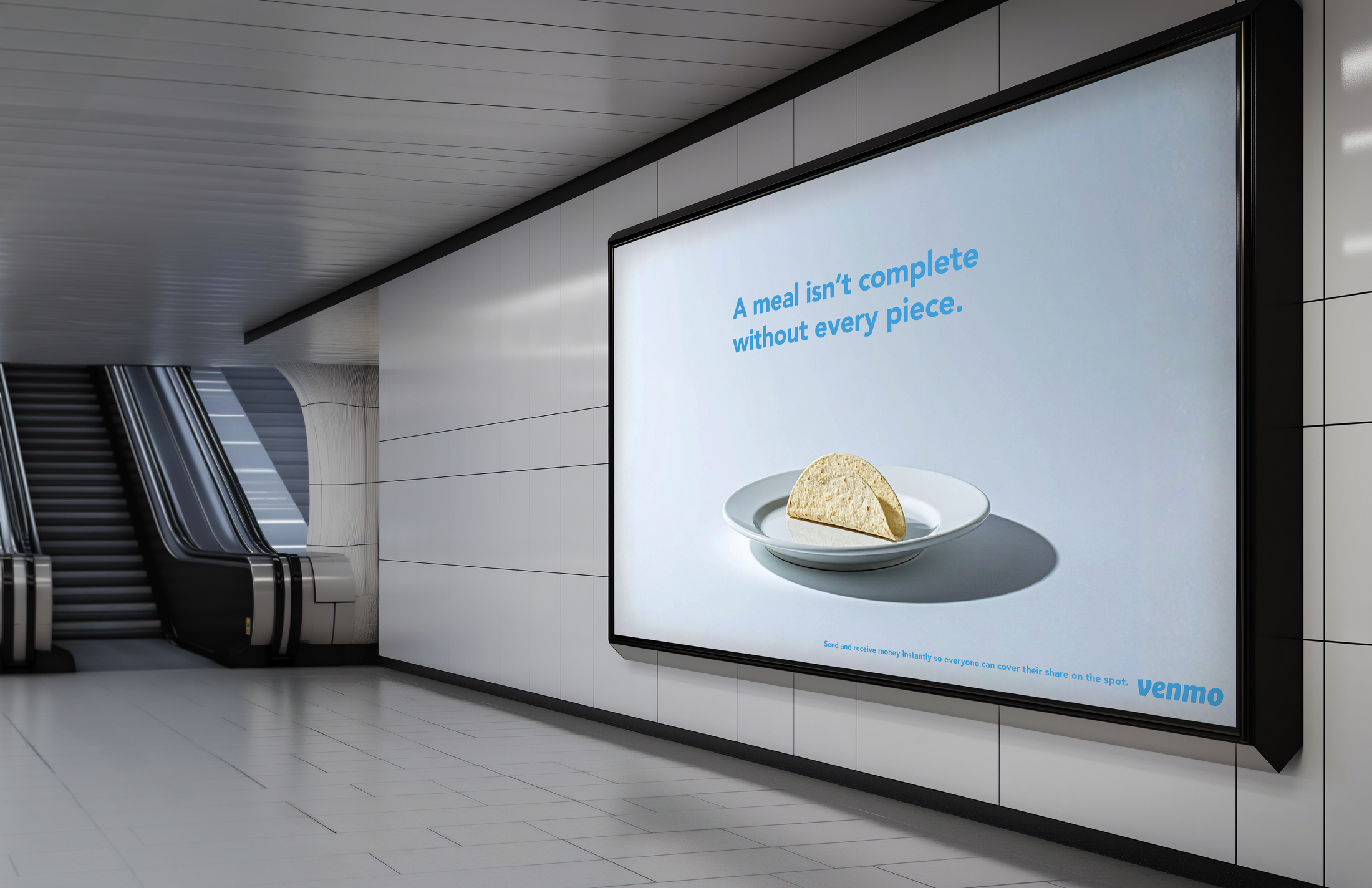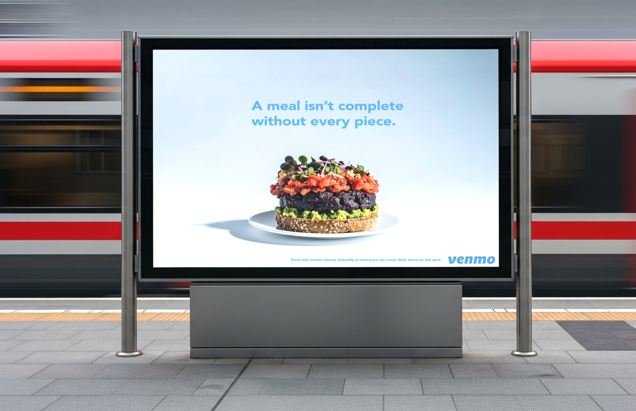 Execution: Incomplete meals are shown in outdoor posters to visually represent unpaid shares, while a digital Venmo experience mirrors this tension in-app and resolves it once everyone pays.