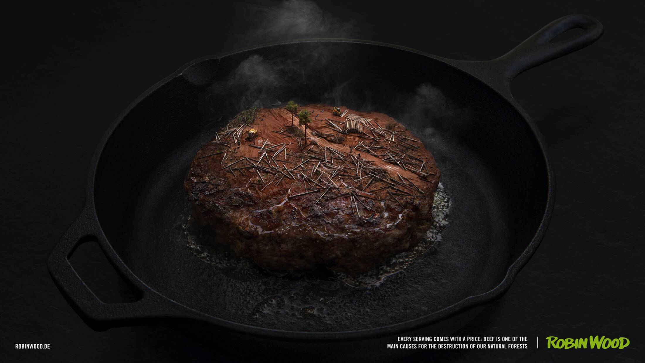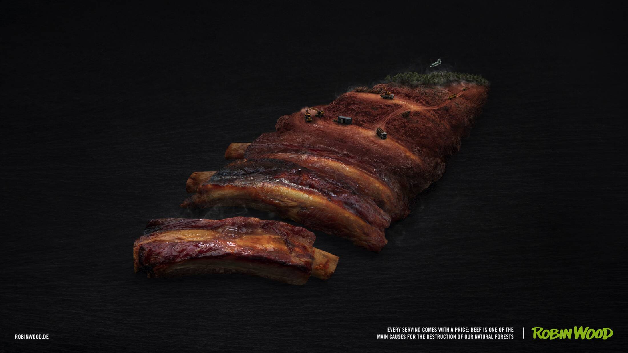 In many parts of the world deforestation of natural forests is progressing at a relentless pace. Tropical forests in South America in particular are being cleared - mostly illegally - to make room for cattle farms and soya plantations. Serviceplan Campaign X has developed a striking print campaign for the environmental and nature conservation organization ROBIN WOOD, which effectively visualizes the devastating effects of deforestation.