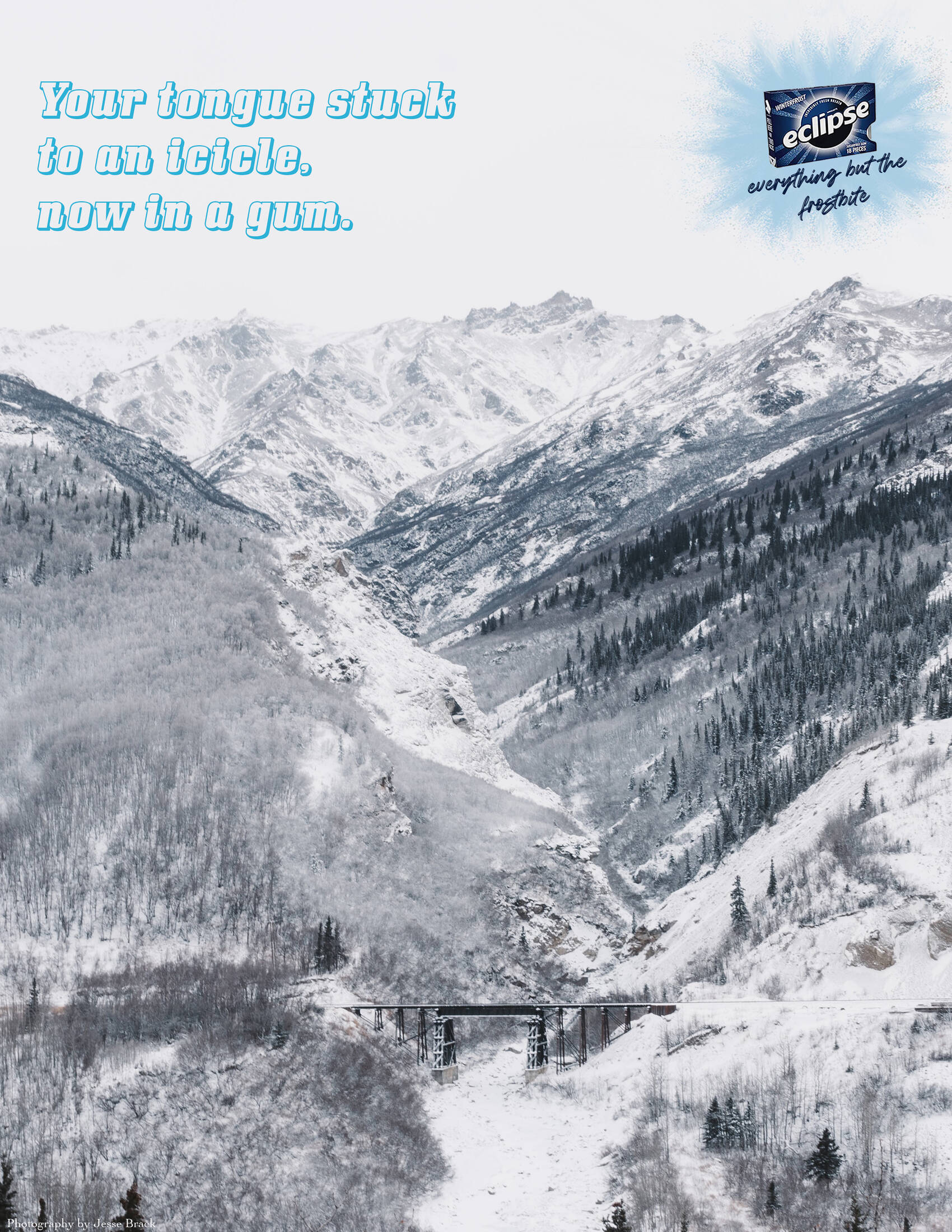 This student campaign titled 'Everything But The Frostbite' was published in United States in June, 2020. It was created for the brand: Eclipse, by ad school: University of Illinois at Urbana-Champaign. This Integrated medium campaign is related to the Confectionery, Snacks industry and contains 9 media assets. It was submitted over 5 years ago by Copywriter: Emma Campanella.