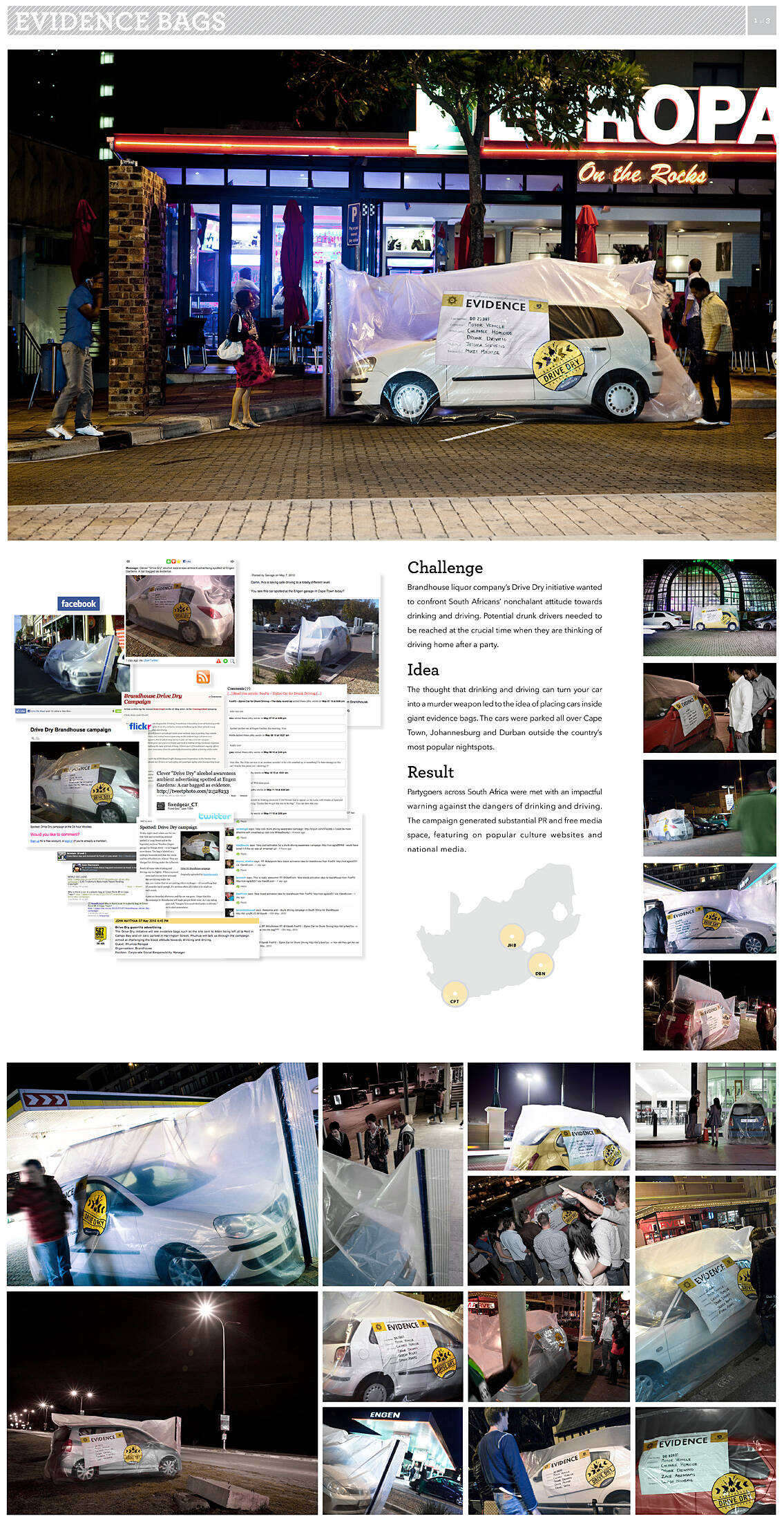 Brandhouse liquor company's Drive Dry initiative wanted to confront South African's nonchalant attitude towards drinking and driving. Potential drunk drivers needed to be reached at the crucial time when they are thinking of driving home after a party. The thought that drinking and driving turns your car into a murder weapon led to the idea of placing cars inside giant evidence bags. Watch the video.