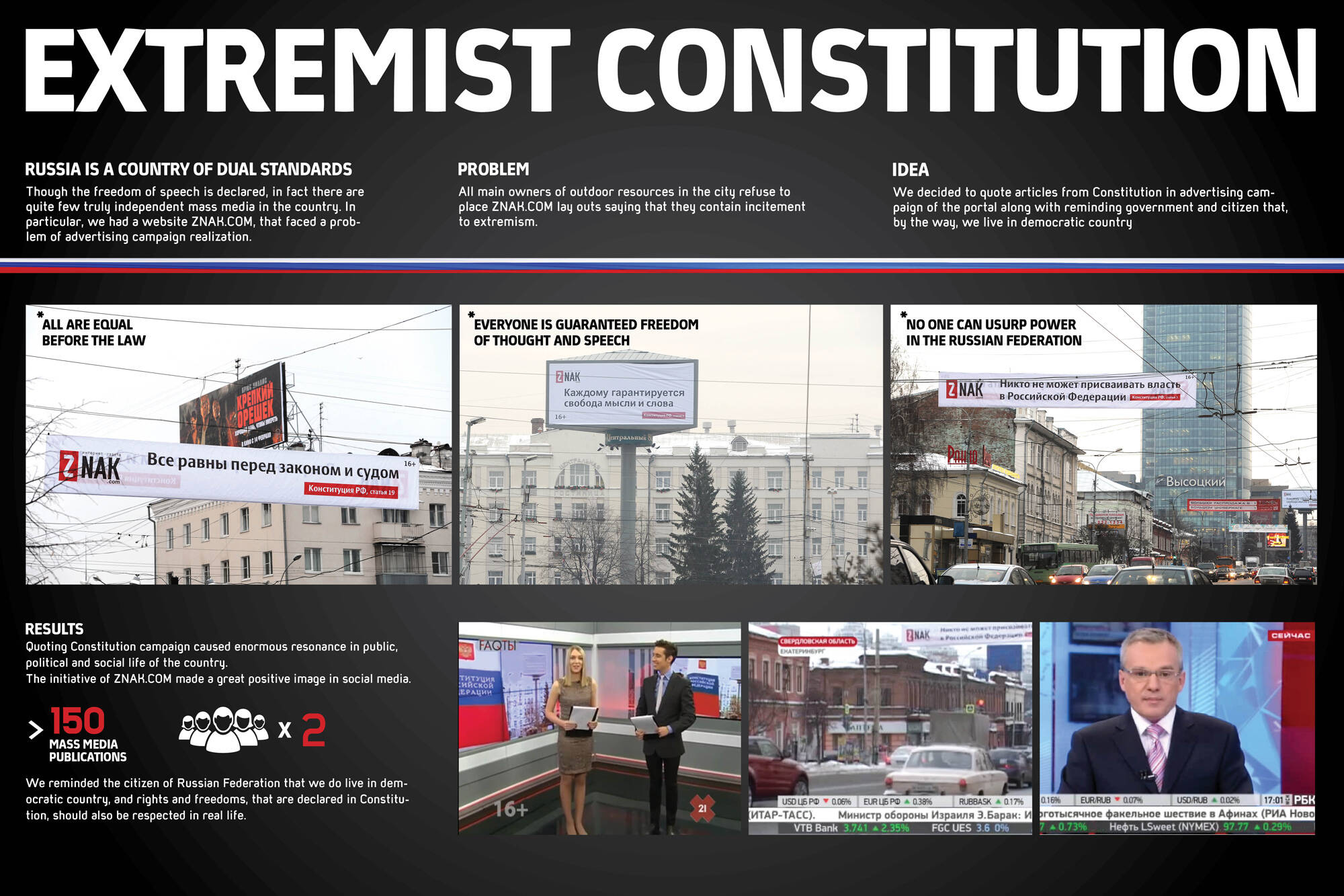 This professional campaign titled 'Extremist constitution' was published in Russia in February, 2013. It was created for the brand: znak.com, by ad agency: Red Pepper. This OOH Outdoor medium campaign is related to the Media industry and contains 1 media asset. It was submitted almost 13 years ago.