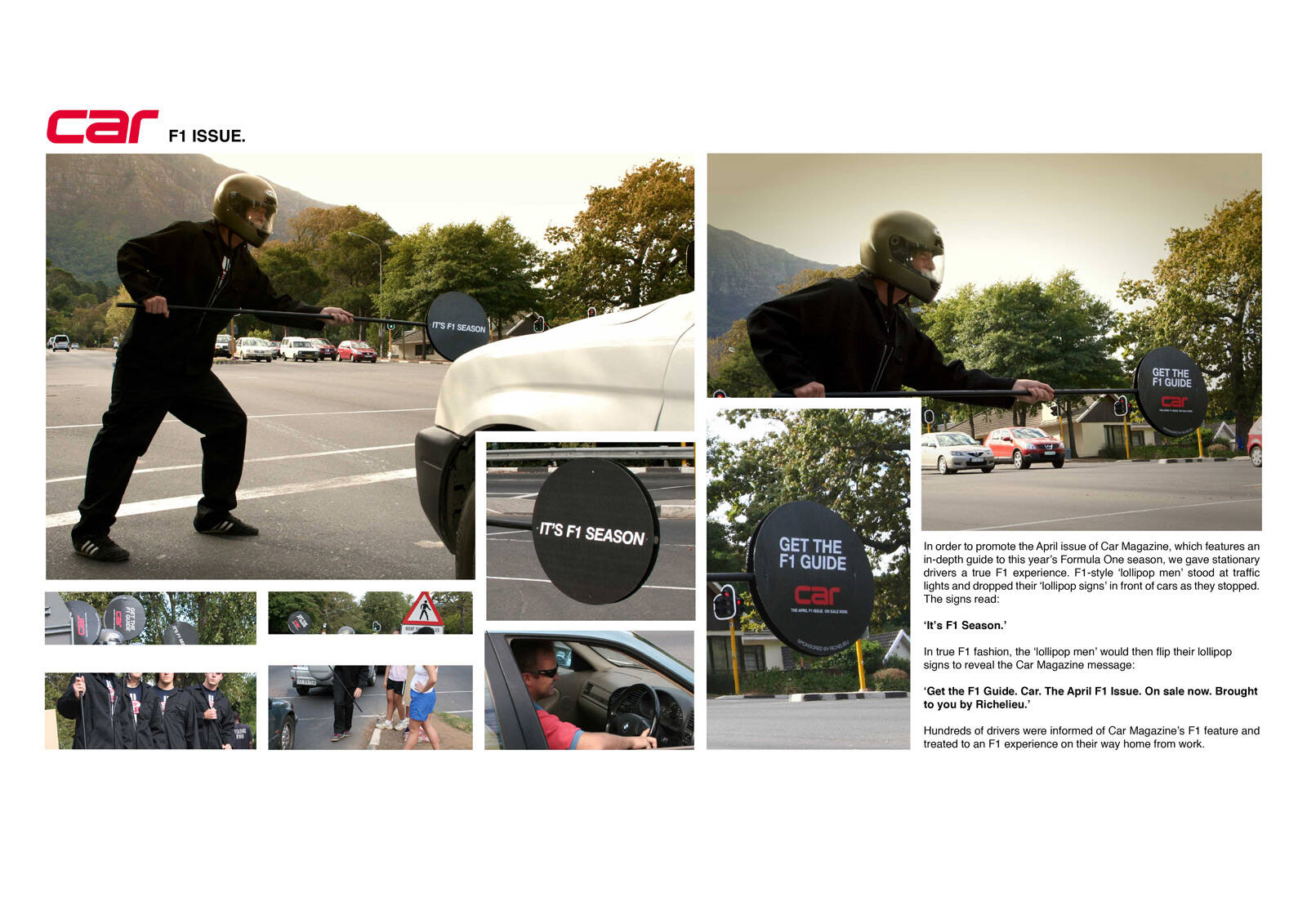 This professional campaign titled 'F1' was published in South Africa in April, 2009. It was created for the brand: CAR Magazine, by ad agency: Ogilvy. This Ambient medium campaign is related to the Media industry and contains 1 media asset. It was submitted over 16 years ago.