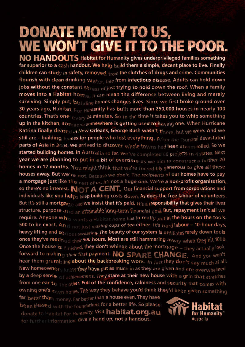 This professional campaign titled 'Face' was published in Australia in March, 2008. It was created for the brand: Habitat for Humanity, by ad agency: BBDO. This Print medium campaign is related to the Public Interest industry and contains 1 media asset. It was submitted over 17 years ago.