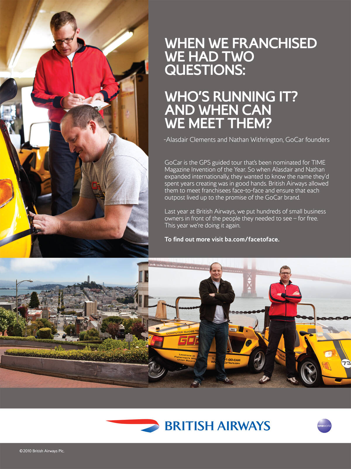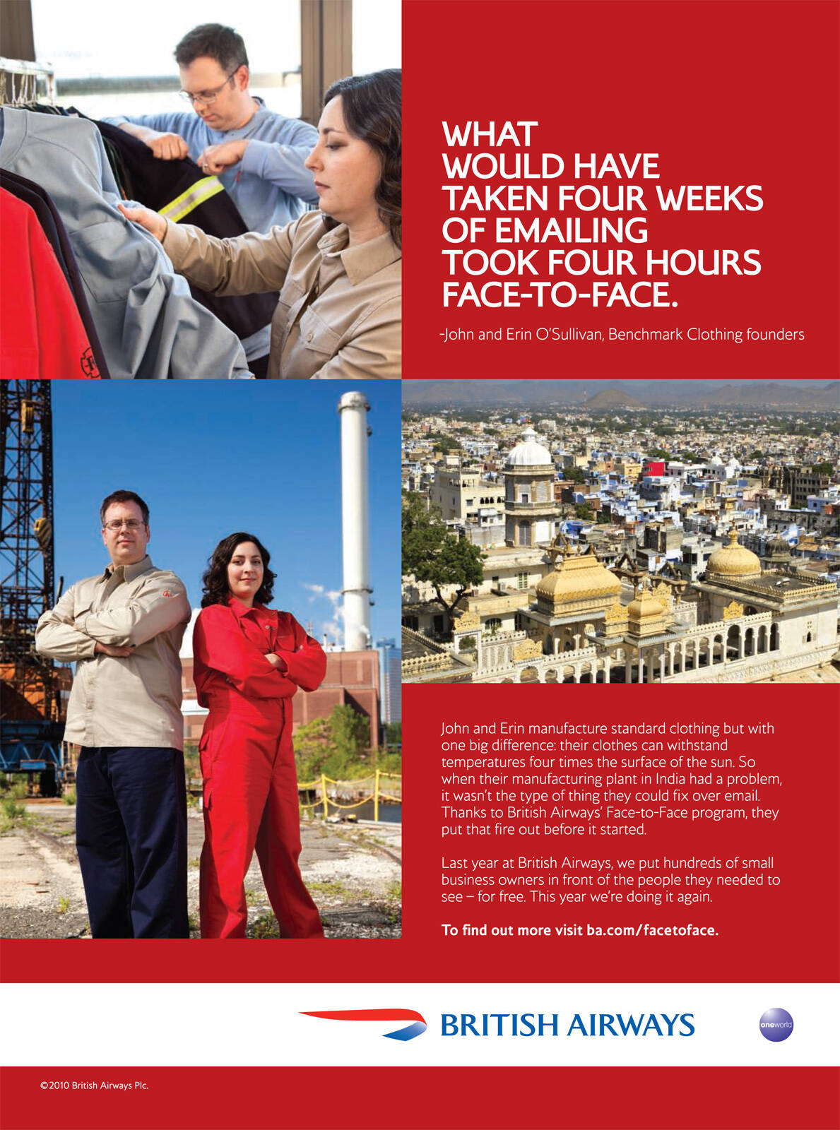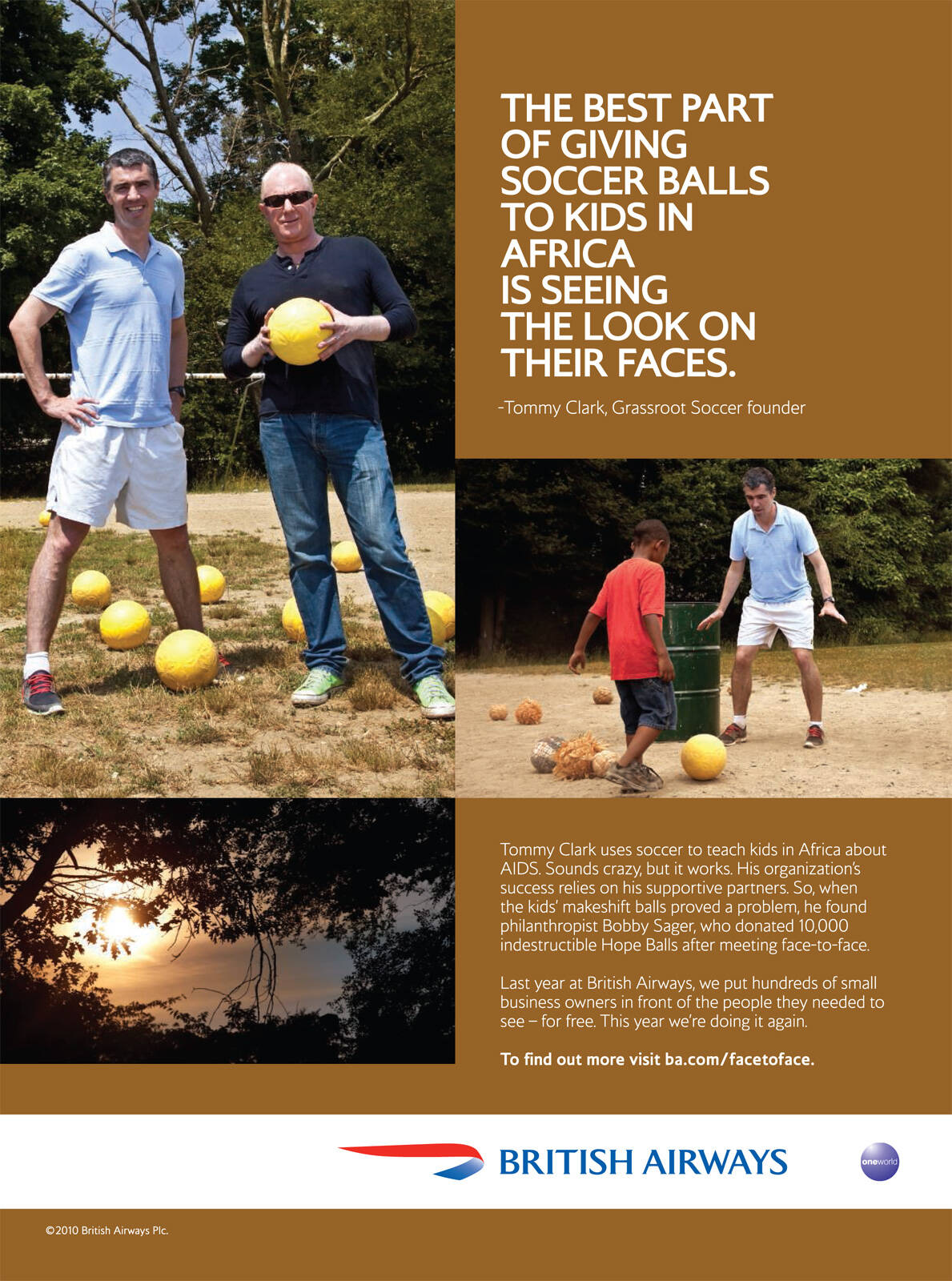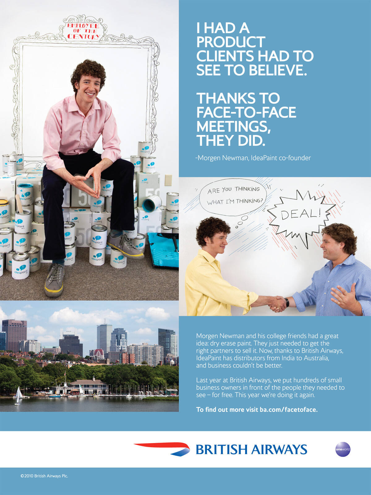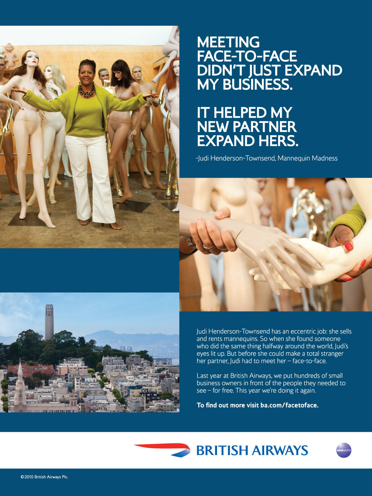 This professional campaign titled 'Face-to-Face Flight, Face-to-Face Program, Face-to-Face P...' was published in United States in October, 2010. It was created for the brand: British Airways, by ad agency: BBH. This Ambient medium campaign is related to the Transport industry and contains 6 media assets. It was submitted about 15 years ago.