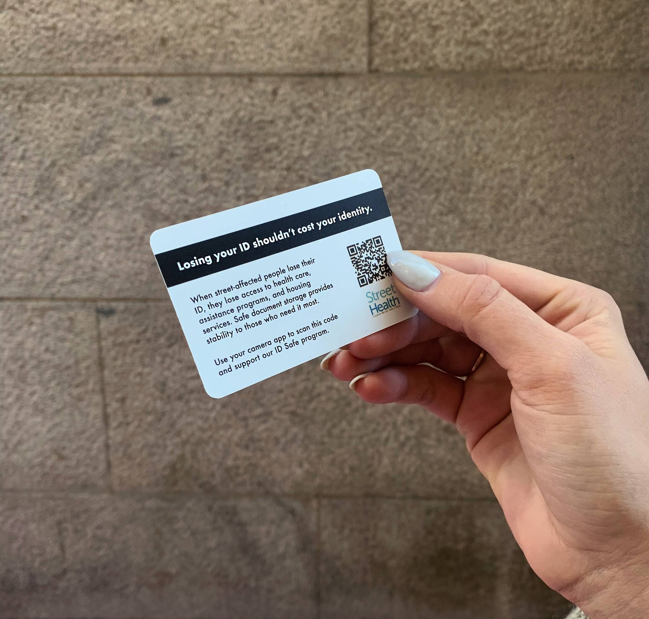 The cards were left in common places such as bus stops, cafe tables, and grocery baskets. When the cards were discovered and examined by good samaritans, they received an educational message: “When street-affected people lose their ID, they lose access to health care, assistance programs, and housing services. Safe document storage provides stability to those who need it most.”