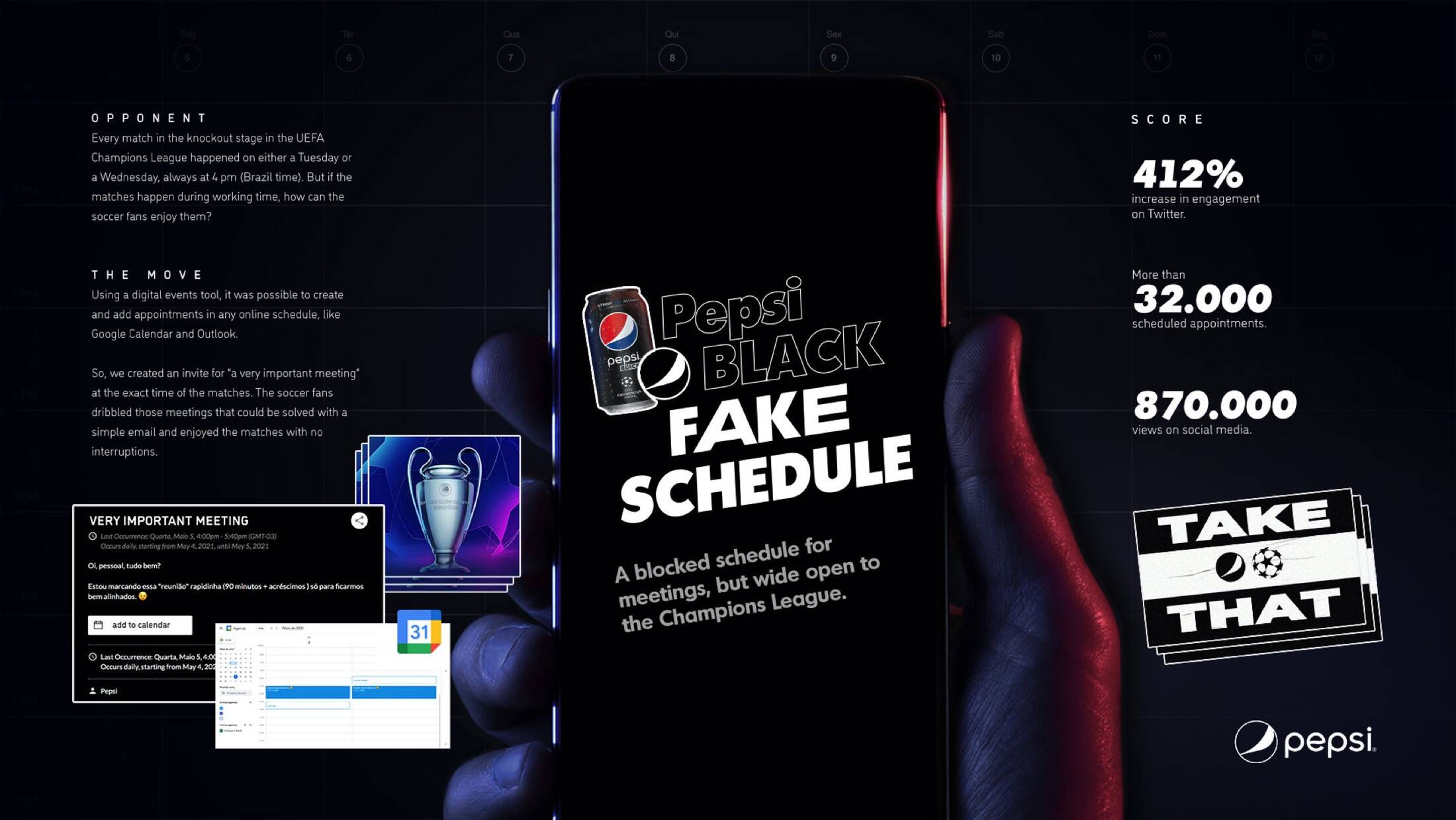 Everyone knows that Brazilians love football and a passion for international championships, has become part of the fans' routine. Through a tool that allows the user to add appointments to any online calendar such as Google Calendar and Outlook, Pepsi created the invitation for a "Very Important Meeting" that takes place precisely during game times. "The idea is not to encourage people to miss important meetings, but to bypass those meetings that could be an email".