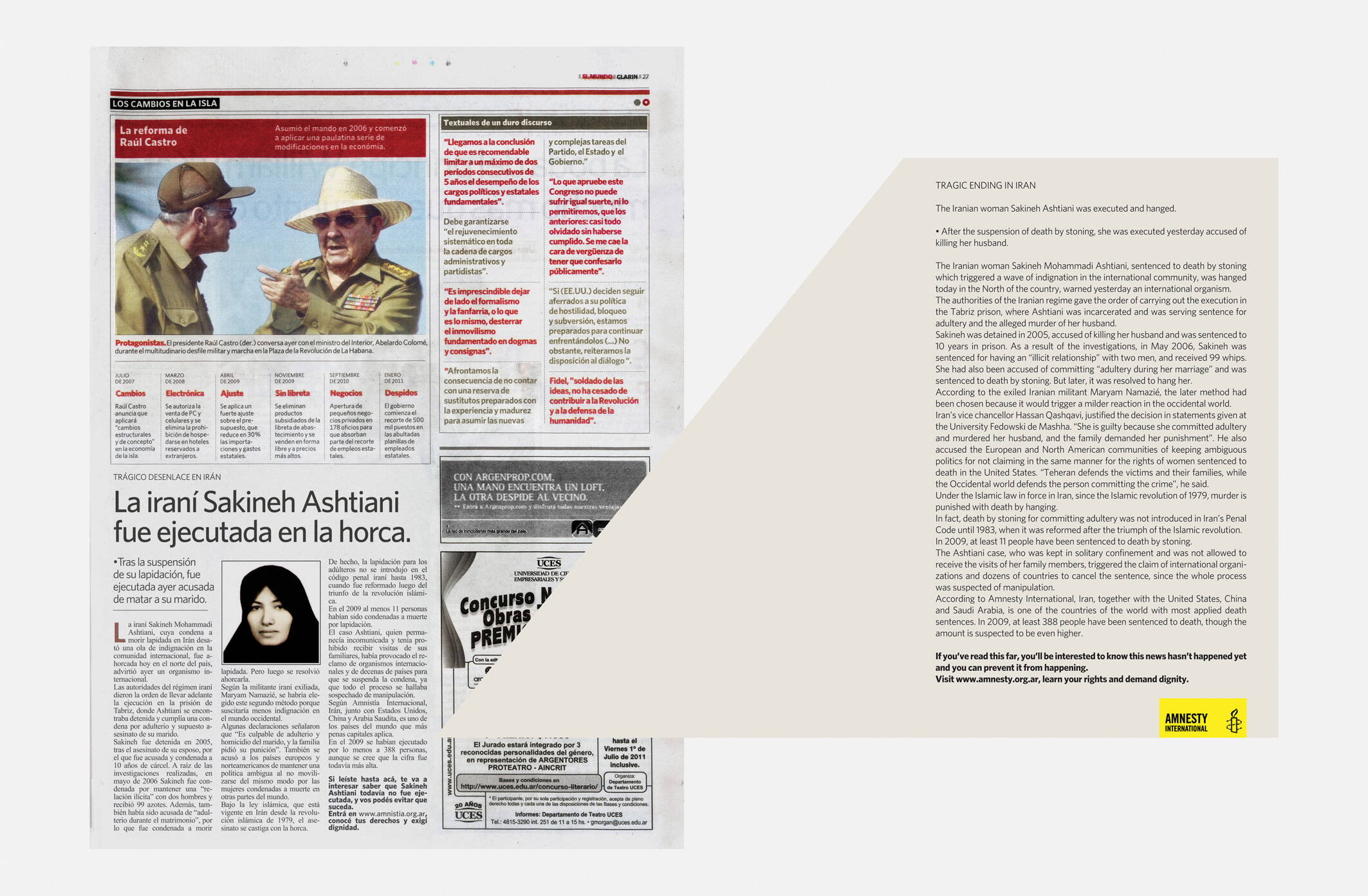 This professional campaign titled 'Fake News, Liu Xiaobo, Fake News, Sakineh Ashtiani, Heaven' was published in Argentina in May, 2011. It was created for the brand: Amnesty International, by ad agency: Y&R. This Print medium campaign is related to the Public Interest industry and contains 3 media assets. It was submitted over 14 years ago.