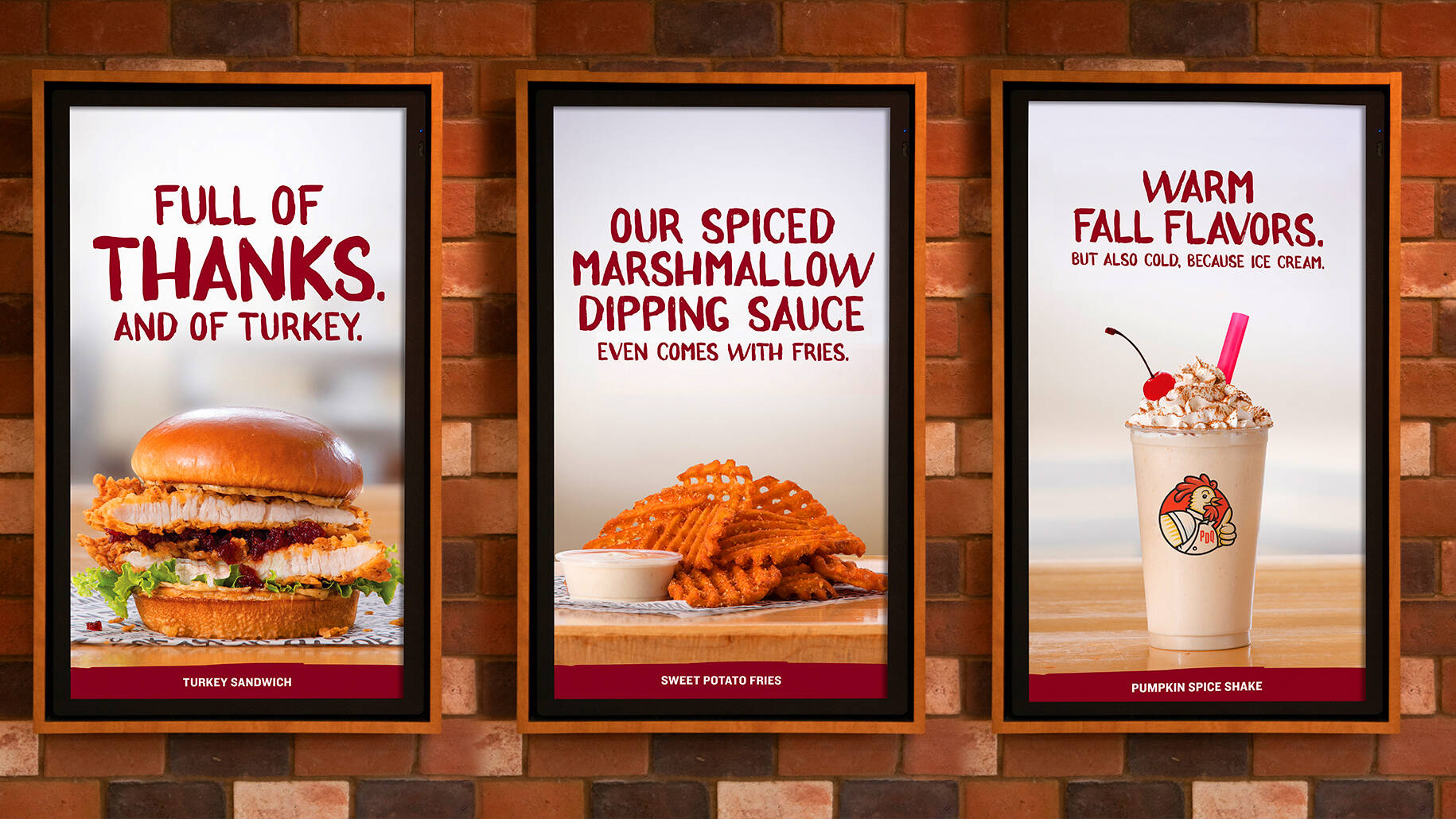 This professional campaign titled 'Fall Menu Point of Sale' was published in United States in October, 2019. It was created for the brand: PDQ, by ad agency: PPK. This OOH Outdoor medium campaign is related to the Food industry and contains 1 media asset. It was submitted about 6 years ago by Group Creative Director: Paul Prato of PPK.